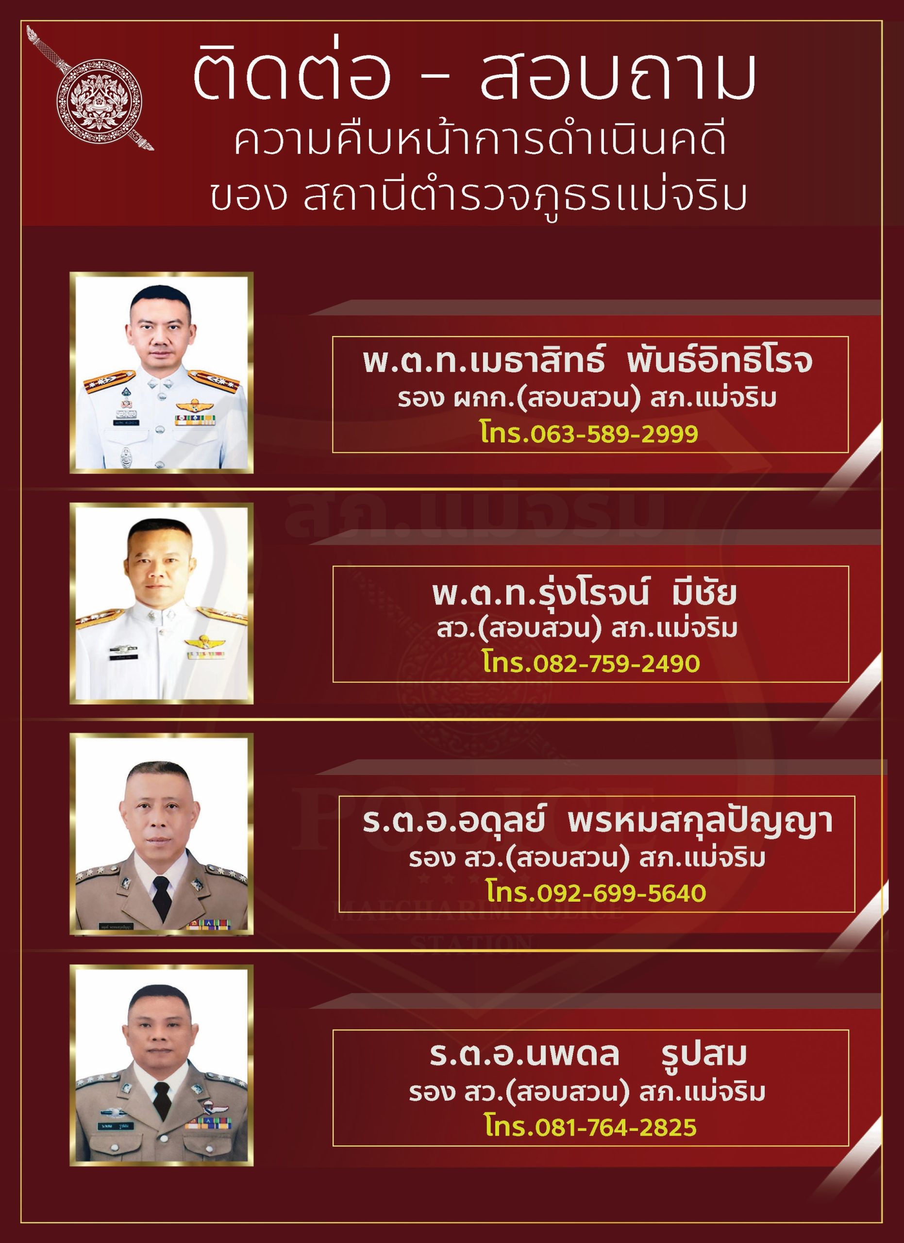 ขอเชิญชวน ผู้มารับบริการ / มาติดต่อ สถานีตำรวจภูธรแม่จริม