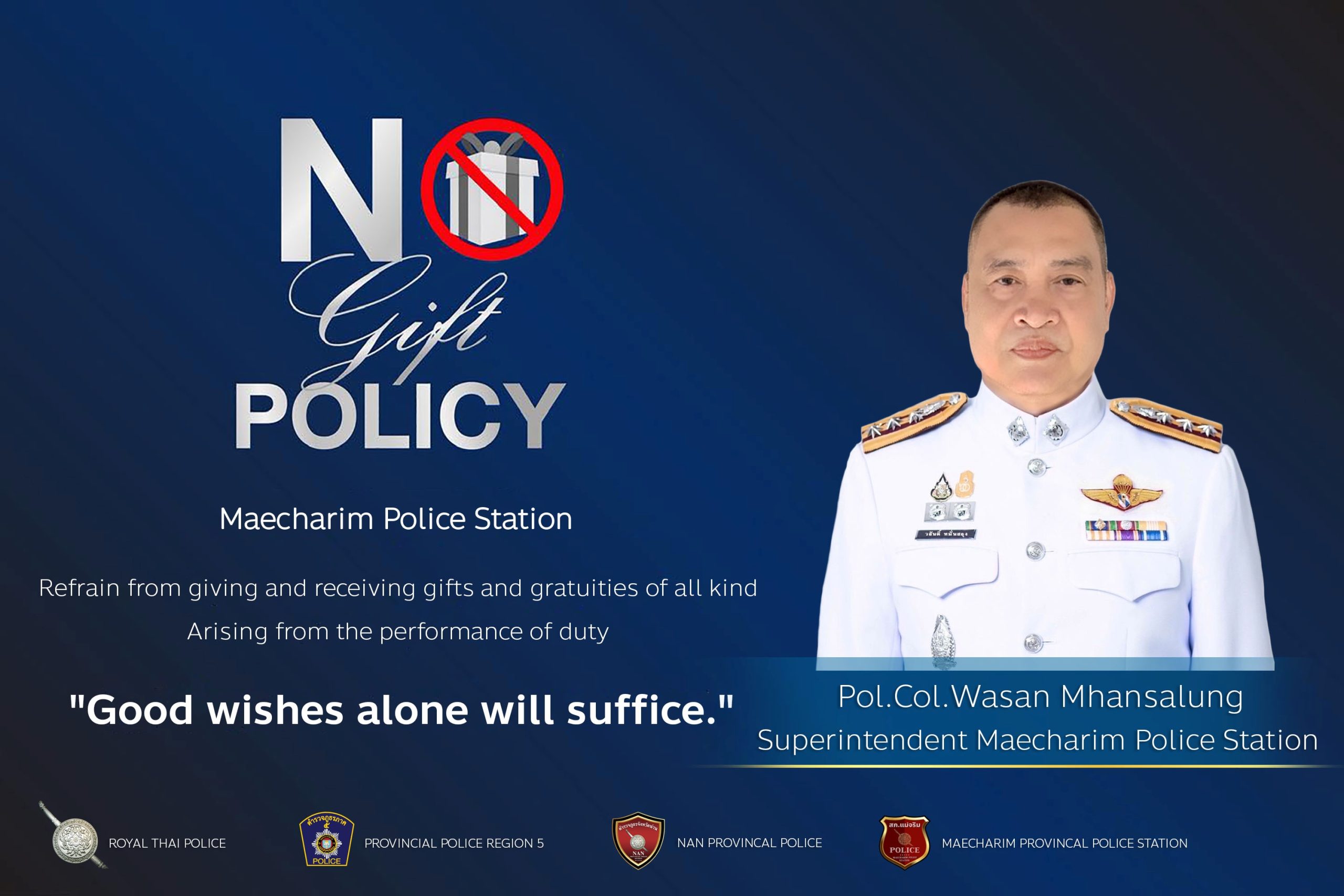 พ.ต.อ.วสันติ์ หมั่นสลุง ผกก.สภ.แม่จริม ได้เรียกประชุมชี้แจงข้อราชการให้กับสายงานอำนวยการ, หัวหน้าเจ้าหน้าที่พัสดุและเจ้าหน้าที่ผู้รับผิดชอบการจัดซื้อจัดจ้าง กำชับให้ปฏิบัติตามนโยบายต่อต้านการรับสินบน (Anti-Bribery Policy) และการไม่รับของขวัญของกำนัลหรือประโยชน์อื่นใด (No Gift Policy) จากการปฏิบัติหน้าที่