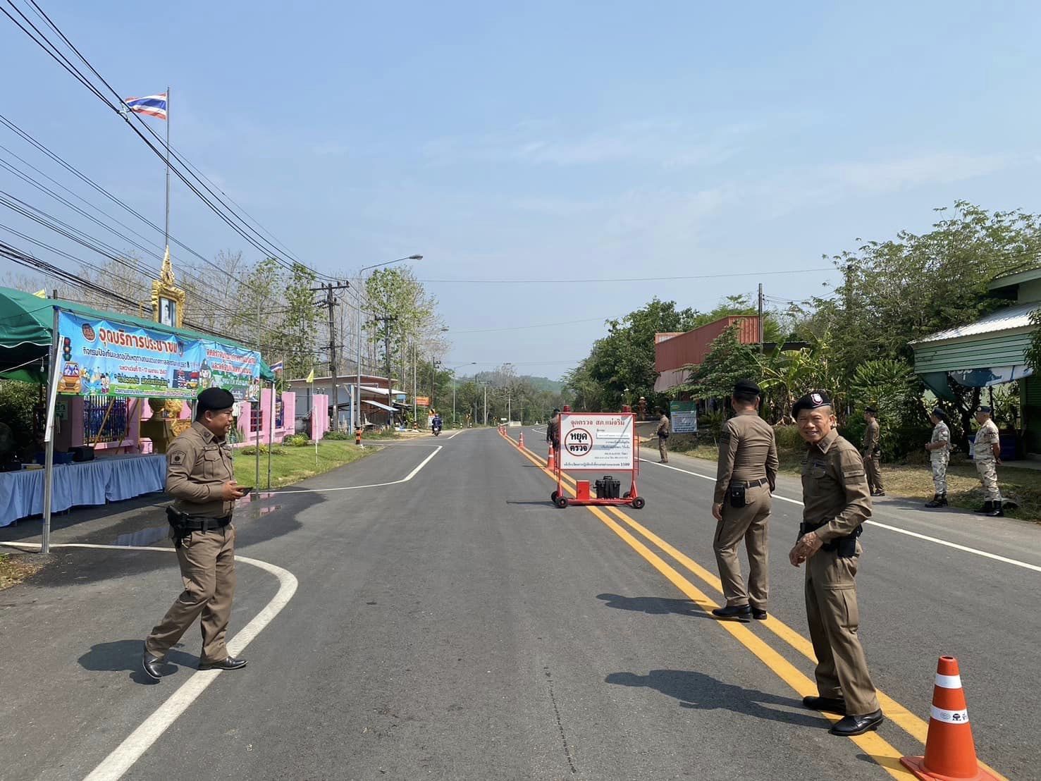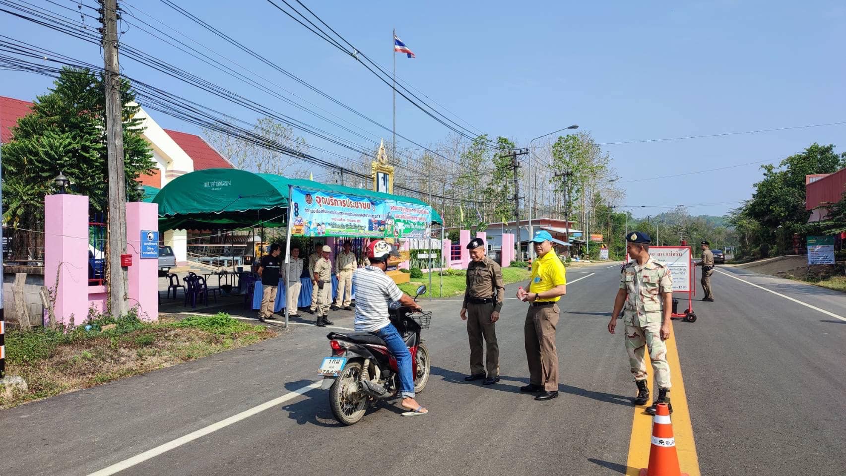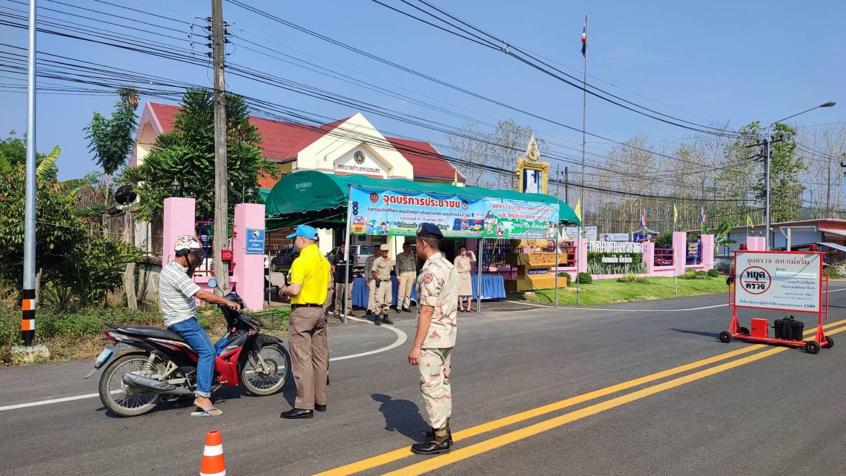 สภ.แม่จริม ภ.จว.น่าน วันนี้ (13 เม.ย. 2567) เวลา 09.00 น. โดยการอำนวยการของ พ.ต.อ.วสันติ์ หมั่นสลุง ผกก.สภ.แม่จริม มอบหมายให้ พ.ต.ท.วีฬเวชน์ ร้านชิตวงศ์ รอง ผกก.ป.สภ.แม่จริม, พ.ต.ท.มนตรี ขอดเตชะ สวป.สภ.แม่จริม, ร.ต.ท.ภูมิวิกรณ์ สอนนนฐีท์กูล รอง สว.(ป.) สภ.แม่จริม นำข้าราชการตำรวจประจำจุดตรวจบูณาการร่วมป้องกันและลดอุบัติเหตุทางถนนช่วงเทศกาลสงกรานต์ ประจำปี 2567 พร้อมด้วยเจ้าหน้าที่ฝ่ายปกครองอำเภอแม่จริม ร่วมกันตั้งจุดตรวจ จุดสกัด ป้องกันและลดอุบัติเหตุทางถนน ช่วงเทศกาลสงกรานต์ ประจำปี 2567 และได้ดำเนินกิจกรรม โครงการจิตอาสา “ชีวิตวิถีใหม่ ขับขี่อย่างปลอดภัย ไร้อุบัติเหตุ” เนื่องในเทศกาลสงกรานต์ ประจำปี 2567 โดยร่วมกันรณรงค์ประชาสัมพันธ์การสร้างวินัยและความปลอดภัยทางถนน เพื่อป้องกันและลดอุบัติเหตุฯ พร้อมกันนี้ได้ แนะนำเส้นทาง แจกน้ำดื่มให้กับประชาชนที่สัญจร ณ จุดตรวจหลักบูรณาการร่วมป้องกันและลดอุบัติเหตุทางถนน ช่วงเทศกาลสงกรานต์ ประจำปี 2567 บริเวณถนนด้านหน้าเทศบาลตำบลหนองแดง อ.แม่จริม จ.น่าน