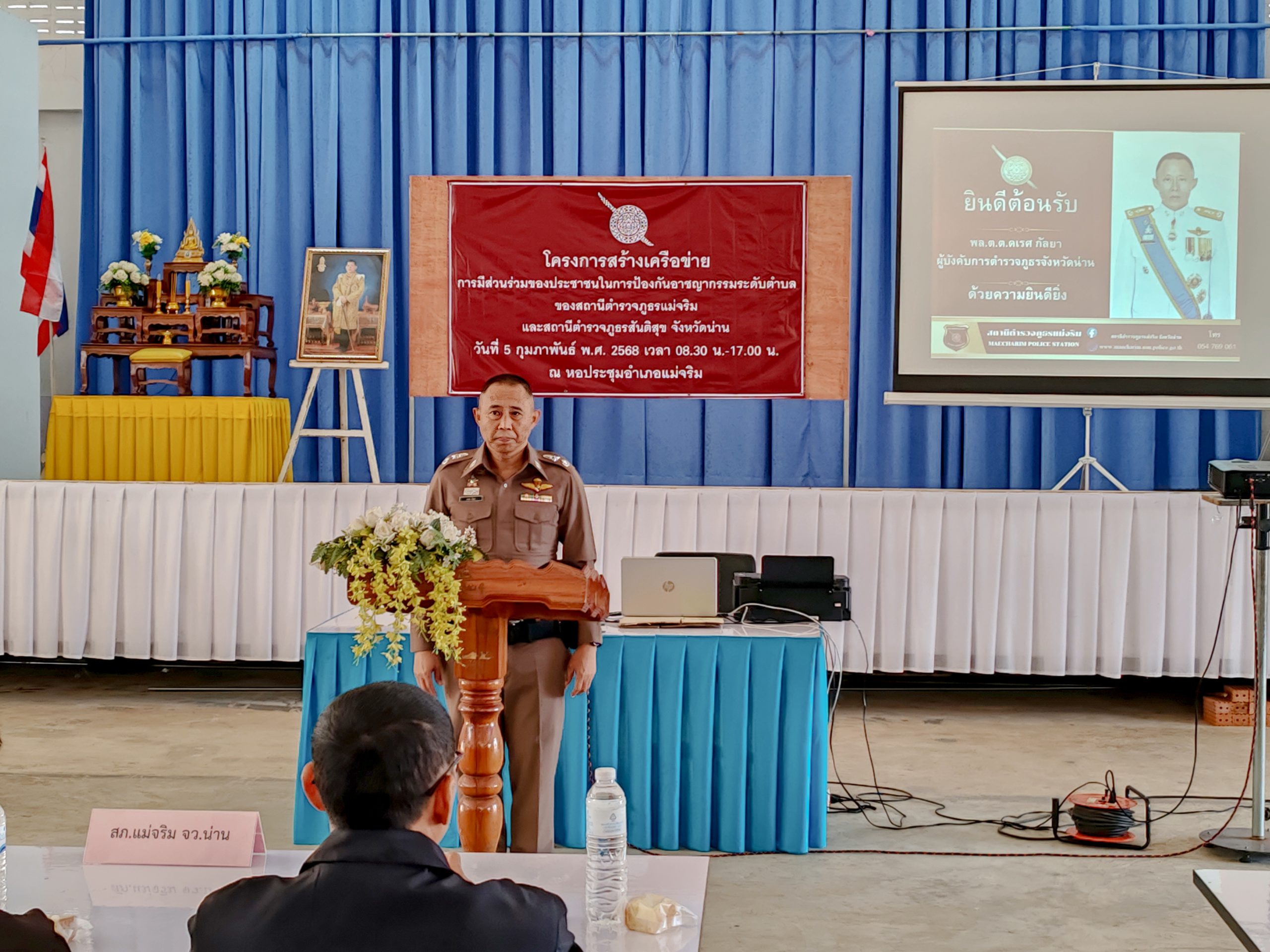 สภ.แม่จริม ภ.จว.น่าน วันนี้ (5 ก.พ.68 เวลา 09.00 น.) นายสามารถ วงค์เลียบ นายกเทศมนตรีตำบลหนองแดง ประธาน กต.ตร.สภ.แม่จริม พร้อมด้วยคณะกรรมการ กต.ตร.สภ.แม่จริม , นายสิโรฒม์ ชมใจ นายอำเภอแม่จริม และข้าราชการตำรวจ สภ.แม่จริม, พ.ต.ท.วีฬวชน์ ร้านชิตวงศ์ รอง ผกก.ป.สภ.แม่จริม, พ.ต.ท.มนตรี ขอดเตชะ สวป.สภ.แม่จริม เข้าร่วมพิธีเปิดการอบรมโครงการสร้างเครือข่ายการมีส่วนร่วมของประชาชนในการป้องกันอาชญากรรมระดับตำบลของสถานีตำรวจภูธรแม่จริมและสถานีตำรวจภูธรสันติสุข จังหวัดน่าน ประจำปีงบประมาณ พ.ศ. 2568 มีวัตถุประสงค์เพื่อแก้ไขปัญหาความเดือดร้อนของประชาชน และสนับสนุนการป้องกันอาชญากรรม โดยมี พล.ต.ต.ดเรศ กัลยา ผู้บังคับการตำรวจภูธรจังหวัดน่าน เป็นประธานในพิธี ฯ พร้อมด้วย สถานีตำรวจภูธรแม่จริม สถานีตำรวจภูธรสันติสุข เจ้าพนักงานปกครองที่ทำการปกครองจังหวัดน่าน เจ้าหน้าที่ปกครอง นายกเทศมนตรีตำบลหนองแดง อ.แม่จริม นายกองค์การบริหารส่วนตำบลดู่พงษ์ อ.สันติสุข และมีผู้เข้ารับการอบรมจำนวน 100 ราย ณ หอประชุมอำเภอแม่จริม จังหวัดน่าน