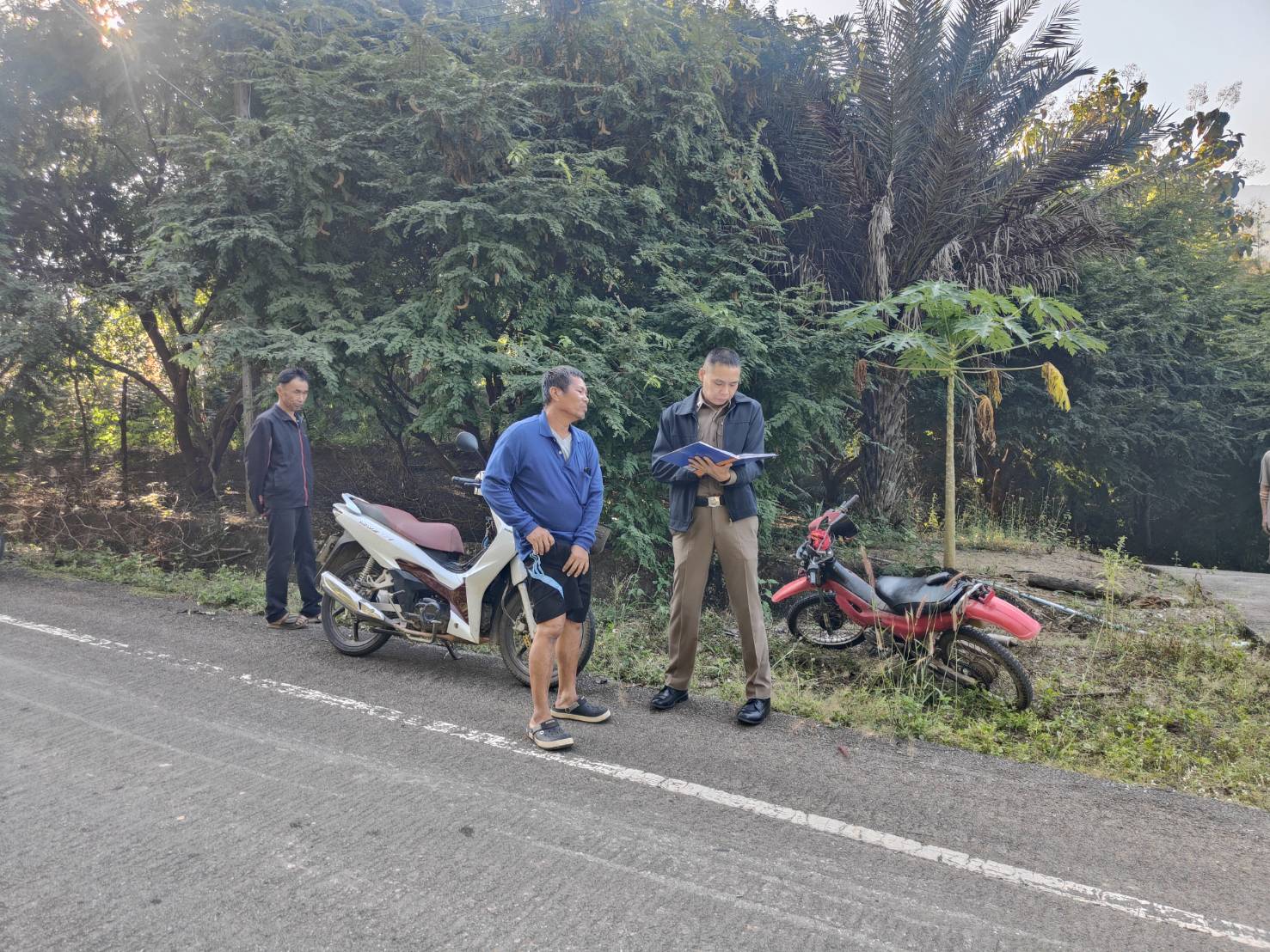 พ.ต.ท.ชัยณวัฒน์ ก้อนแก้ว สว.(สอบสวน) สภ.แม่จริม พร้อมด้วยผู้ช่วยพนักงานสอบสวนเวร ตรวจสอบเหตุรถยนต์ชนกับรถจักรยานยนต์ บริเวณถนนบ้านน้ำพาง ม.4 ต.น้ำพาง อ.แม่จริม จ.น่าน