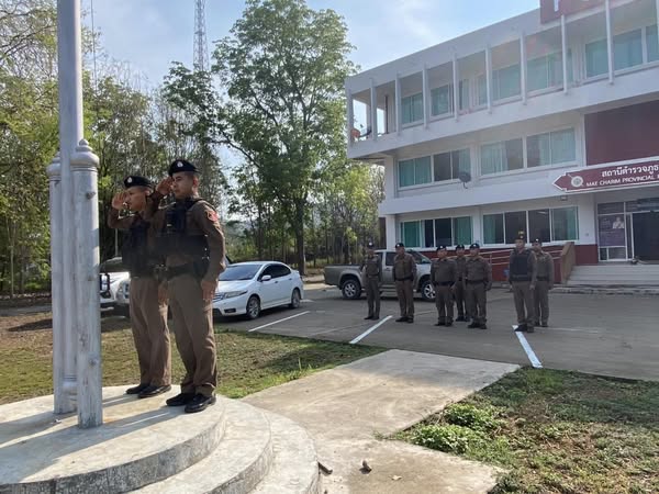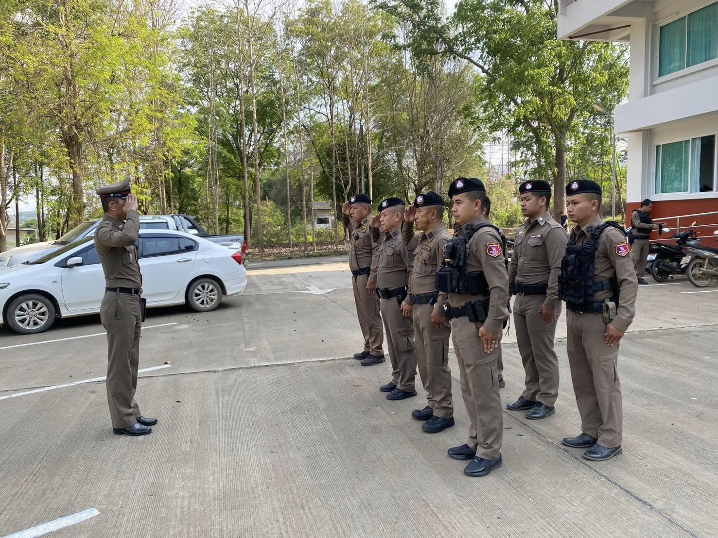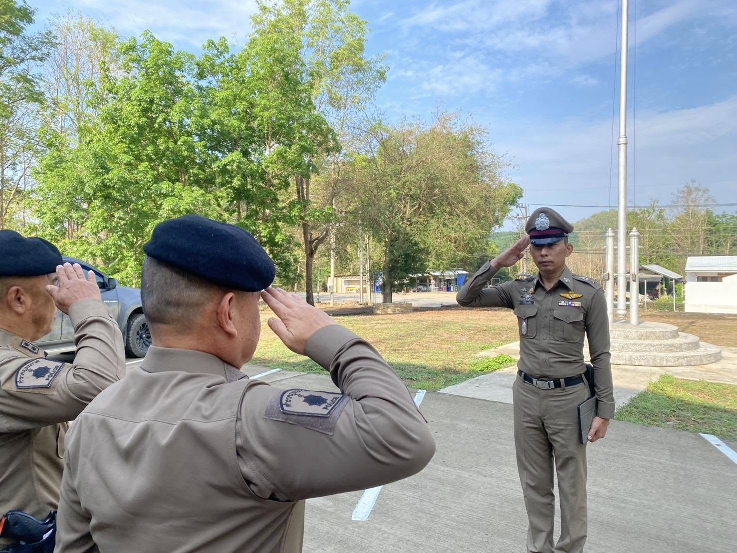 พ.ต.ท.ธวัชชัย คำชื่น รอง ผกก.ป.สภ.นาหมื่น ช่วยราชการ สภ.แม่จริม เรียกแถว ร้อยเวร 20 และสายตรวจ เคารพธงชาติ กล่าวอุดมคติตำรวจ