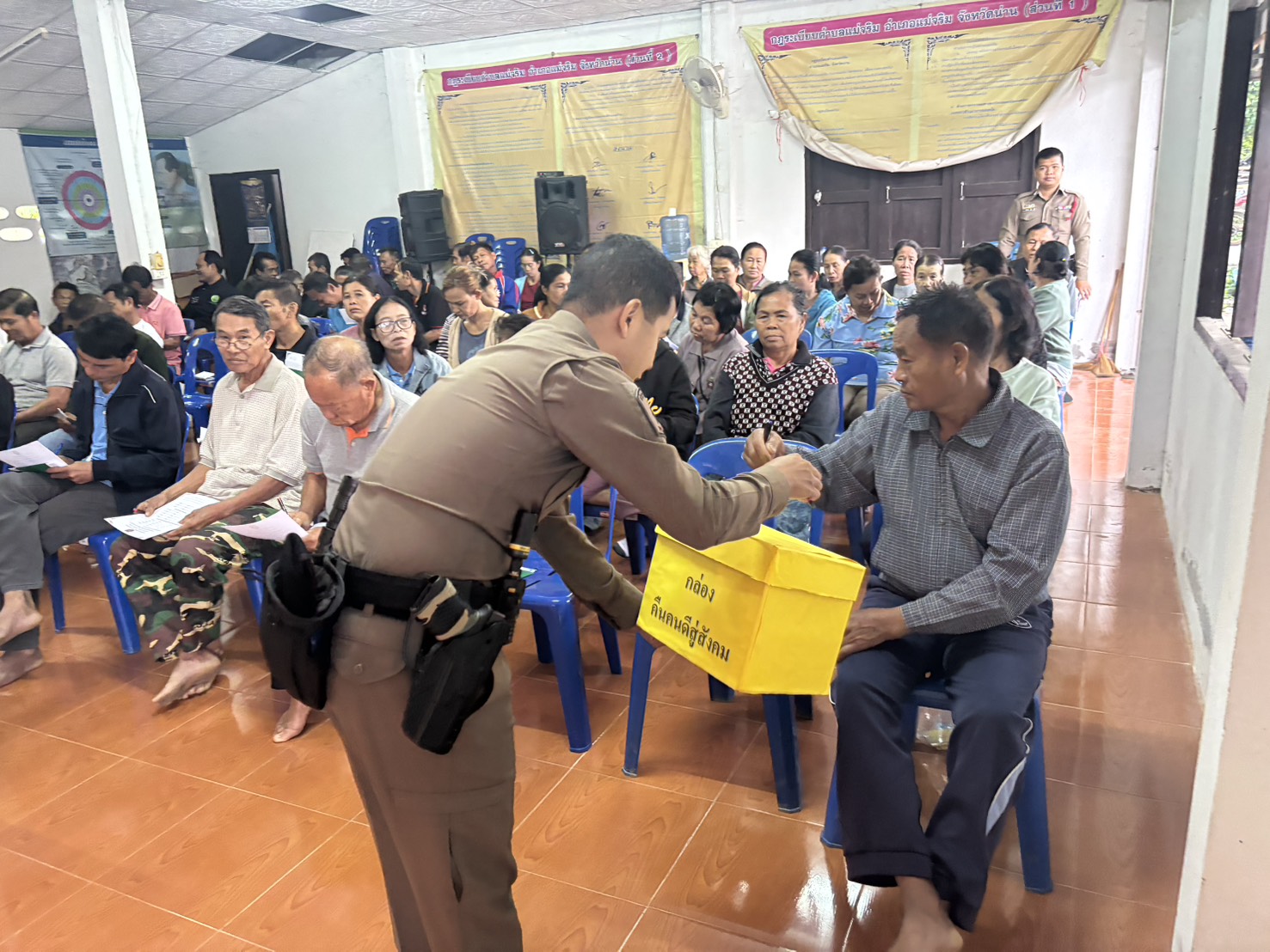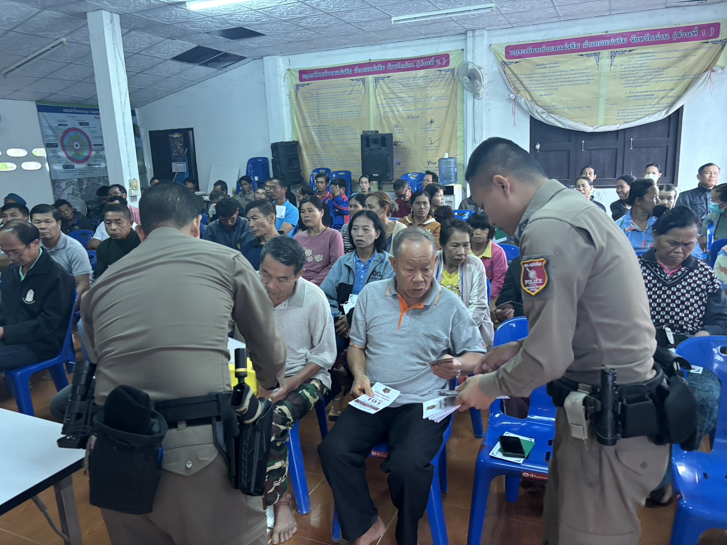 สภ.แม่จริม ภ.จว.น่าน วันนี้ (7 มี.ค.68 เวลา 06.20 น.) โดยการอำนวยการของ พ.ต.อ.วสันติ์ หมั่นสลุง ผกก.สภ.แม่จริม, พ.ต.ท.วีฬเวชน์ ร้านชิตวงค์ รอง ผกก.ป.สภ.แม่จริม, พ.ต.ท.มนตรี ขอดเตชะ สวป.สภ.แม่จริม มอบหมายให้ ร.ต.อ.พงศ์พันธุ์ มีสา รองสวป.สภ.แม่จริม พร้อมเจ้าหน้าที่ชุด ชมส.สภ.แม่จริม ร่วมประชุมและพบปะชาวบ้าน ผู้นำหมู่บ้าน คณะกรรมการหมู่บ้าน อสม. ชุมชนบ้านฝาย ม.2 ต.แม่จริม อ.แม่จริม จ.น่าน เพื่อชี้แจงวัตถุประสงค์และประสานการปฏิบัติ จุดประกายความคิด ชี้ให้เห็นทุกข์ และพิษภัยของยาเสพติด ให้ชาวบ้านในชุมชนมีส่วนร่วมในการแจ้งเบาะแสผู้ที่เกี่ยวข้องกับยาเสพติดโดยใช้กล่องคืนคนดีสู่สังคม เป็นเครื่องมือในการดำเนินงาน รวมทั้งได้แต่งตั้งคณะกรรมการคุ้มและให้บทบาทหน้าที่รับผิดชอบต่างๆ ของคณะกรรมการตามโครงการชุมชนยั่งยืนฯ ประจำปีงบประมาณ พ.ศ.2568 และได้ประชาสัมพันธ์โครงการศูนย์รับแจ้งเหตุฉุกเฉิน 191 ภ.จว.น่าน โดยผู้นำชุมชนมีความเข้าใจและพร้อมให้ความร่วมมืออย่างดี