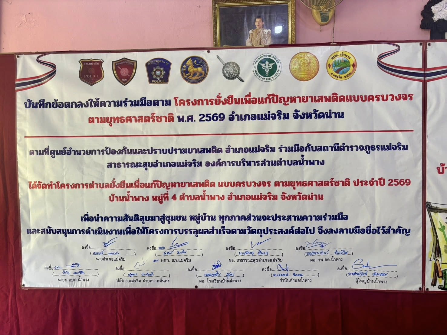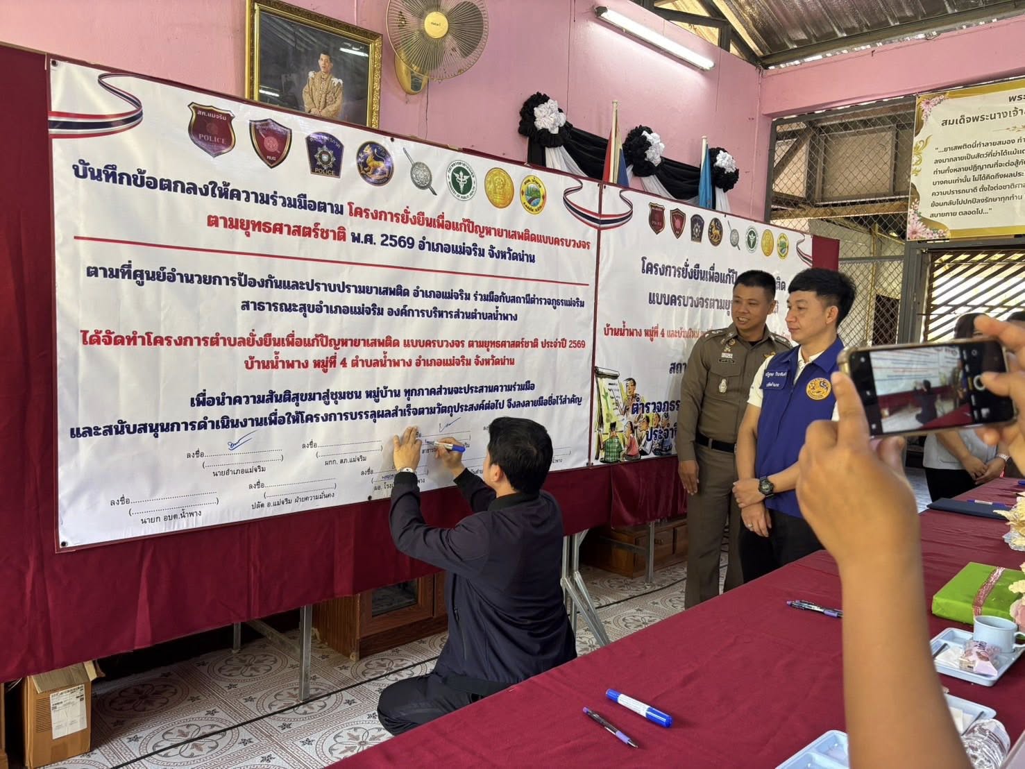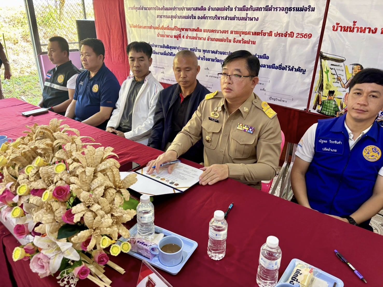 สภ.แม่จริม ภ.จว.น่าน วันนี้ ( 11 ก.พ. 2569 เวลา 10.00 น. ) นายเชาวฤทธิ์ บุตรดาสา นายอำเภอแม่จริม ประธานพิธีเปิดโครงการตำบลยั่งยืนเพื่อแก้ไขปัญหายาเสพติดแบบครบวงจรตามยุทธศาสตร์ชาติ ประจำปีงบประมาณ พ.ศ.2569 โดยมี พ.ต.ท.สุรศักดิ์ มีเสาเรือน รอง ผกก.สส.สภ.แม่จริม, พ.ต.ท.มนตรี ขอดเตชะ สวป.สภ.แม่จริม พร้อมชุดปฏิบัติการตำบลยั่งยืนฯ ของ สภ.แม่จริม พร้อมด้วยส่วนราชการภาคีเครือข่ายฯ ร่วมพิธีเปิดและลงนามบันทึกข้อตกลงให้ความร่วมมือ (MOU) โครงการตำบลยั่งยืนเพื่อแก้ไขปัญหายาเสพติดแบบครบวงจรตามยุทธศาสตร์ ประจำปีงบประมาณ พ.ศ.2569 โดยได้กำหนดหมู่บ้านเป้าหมายที่จะเข้าดำเนินการ ได้แก่ บ้านน้ำพาง ม.4 และ บ้านใหม่ ม.7 ต.น้ำพาง อ.แม่จริม จ.น่าน ณ หอประชุมประจำหมู่บ้านน้ำพาง ต.น้ำพาง อ.แม่จริม จ.น่าน