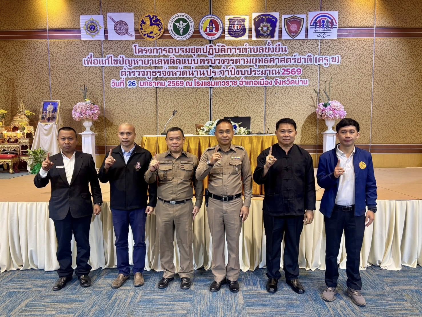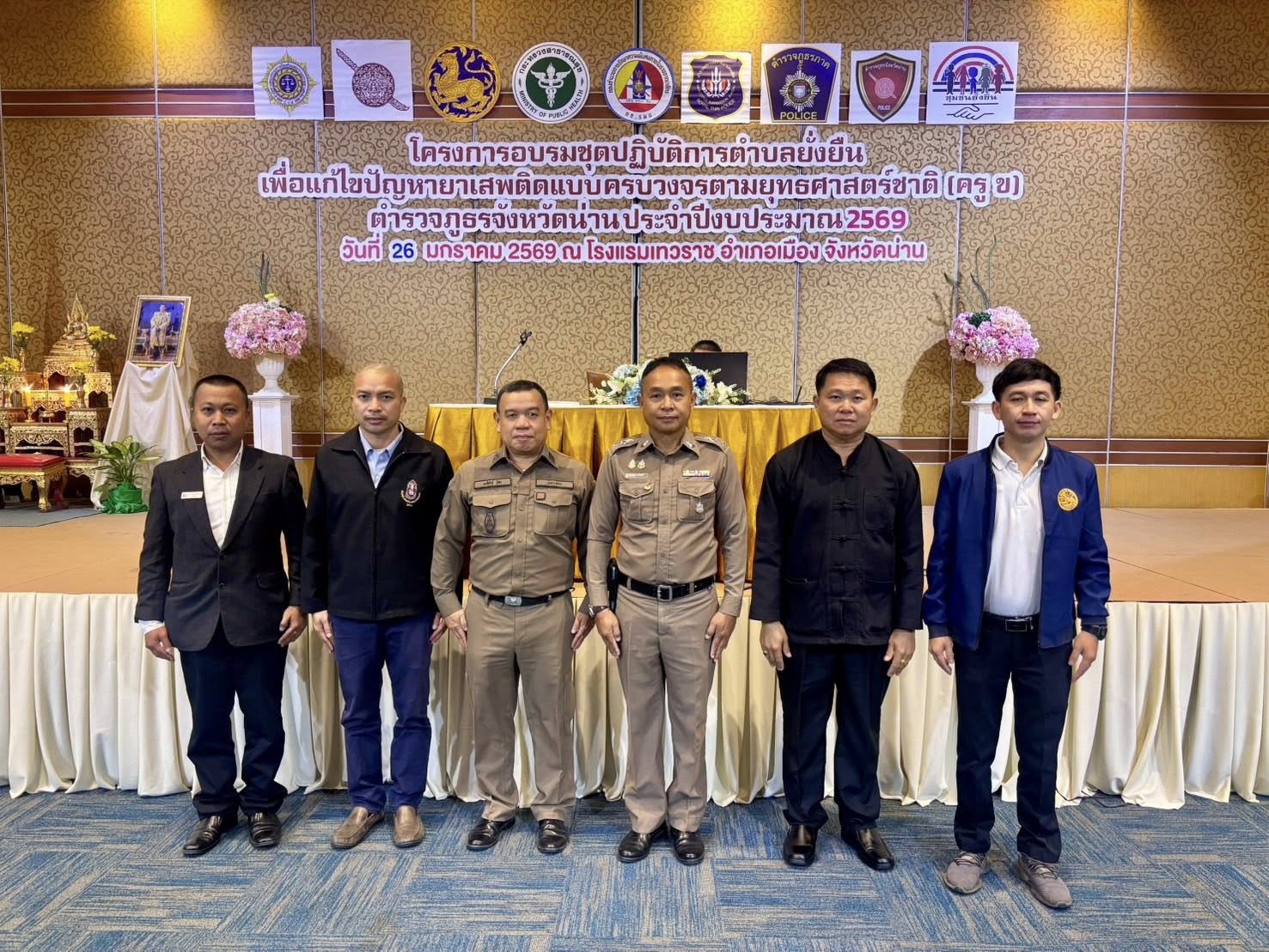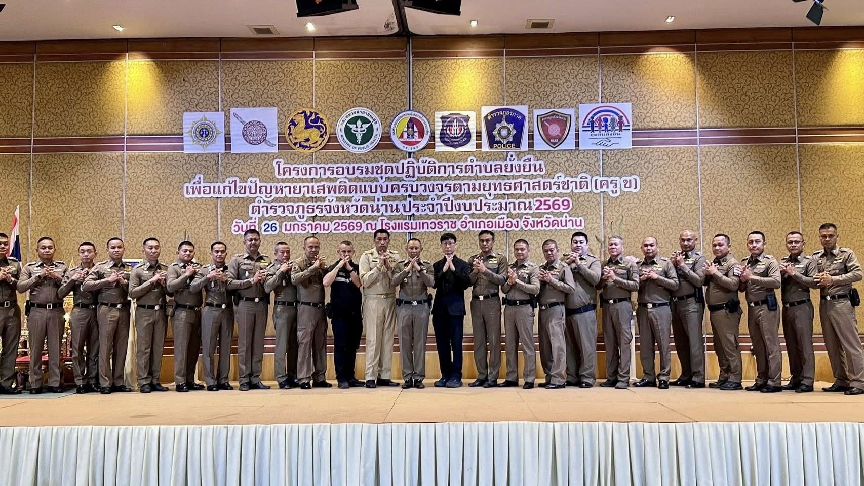 สภ.แม่จริม ภ.จว.น่าน วันนี้ (26 ม.ค.69 เวลา 08.30 - 16.30 น.) โดยการอำนวยการของ พ.ต.อ.วสันติ์ หมั่นสลุง ผกก สภ.แม่จริม มอบหมายให้ พ.ต.ท.ประทีป แปงเขียว รอง ผกก.ป.แม่จริม พร้อมด้วย นายณัฐพล วิระขันคำ ปลัดอำเภอฝ่ายความมั่นคง, ร.ต.อ.พงศ์พันธุ์ มีสา รอง สวป.สภ.แม่จริม, เจ้าหน้าที่ รพ.สต.น้ำพาง, กำนันตำบลน้ำพางและผู้นำชุมชนบ้านน้ำพาง ร่วมอบรมโครงการอบรมชุดปฏิบัติการตำบลยั่งยืน เพื่อแก้ไขปัญหายาเสพติดแบบครบวงจรตามยุทธศาสตร์ชาติ (ครู ข) ณ ห้องประชุมแกรนด์บอลรูม โรงแรมเทวราช อ.เมือง จว.น่าน