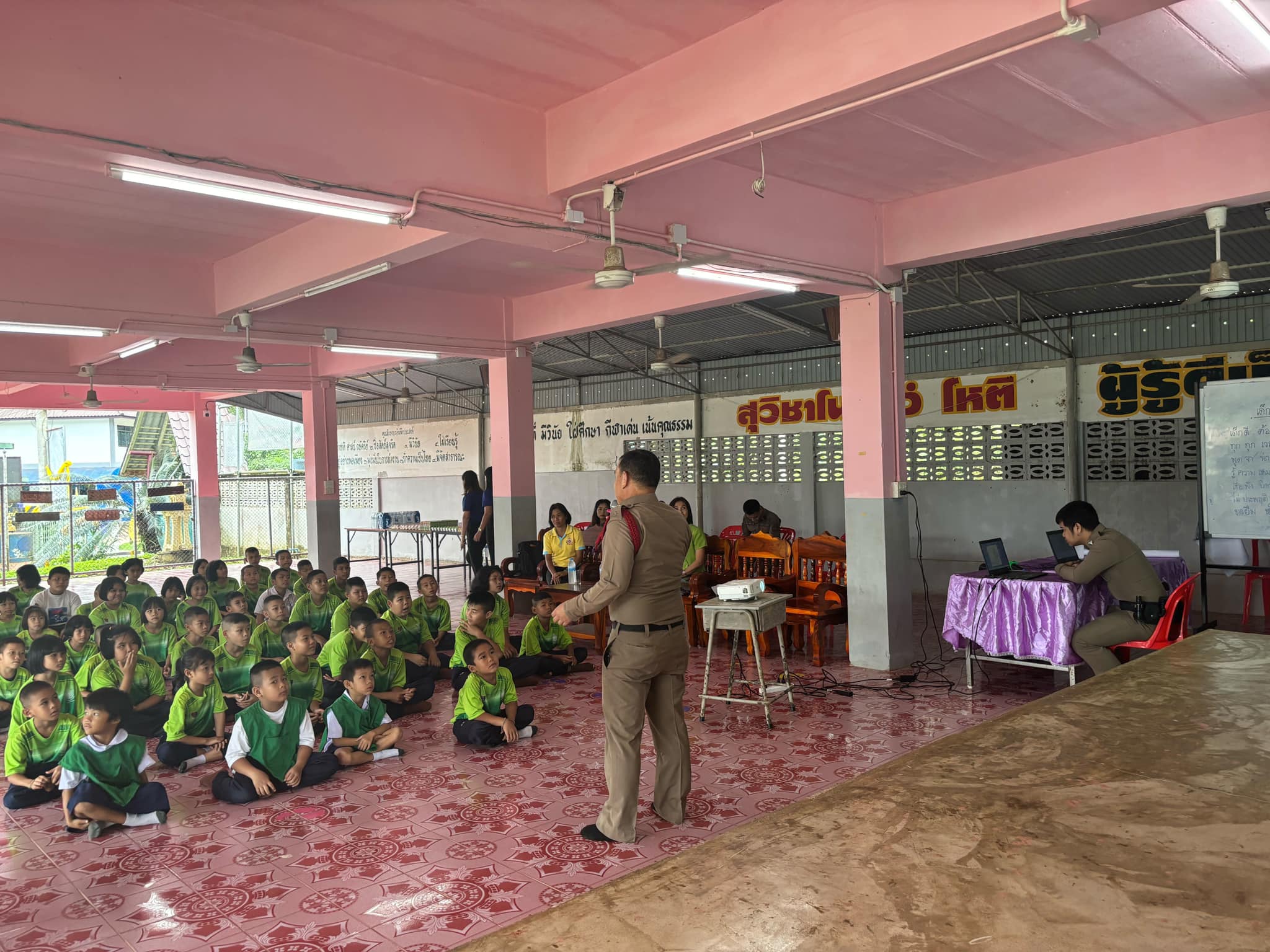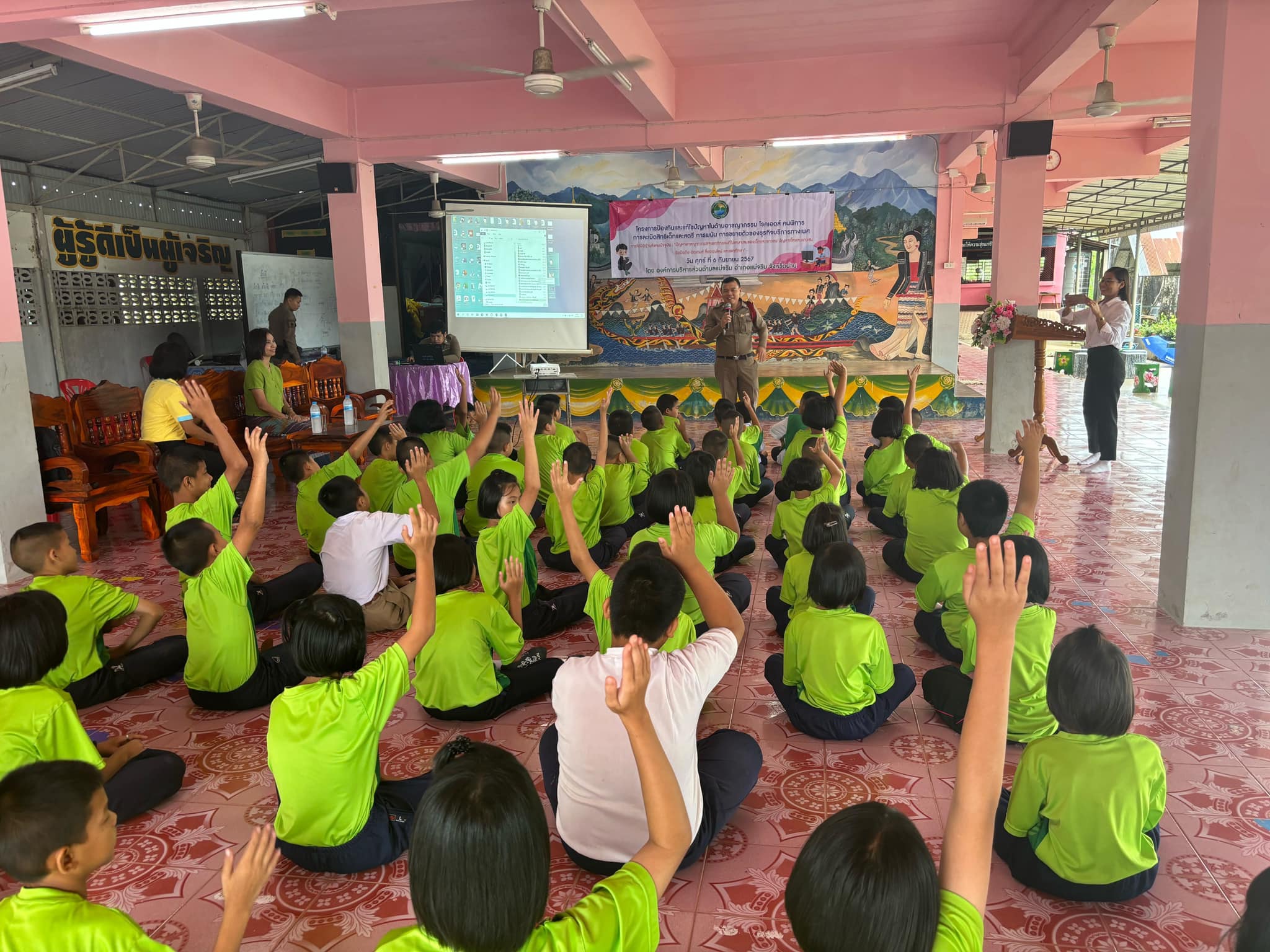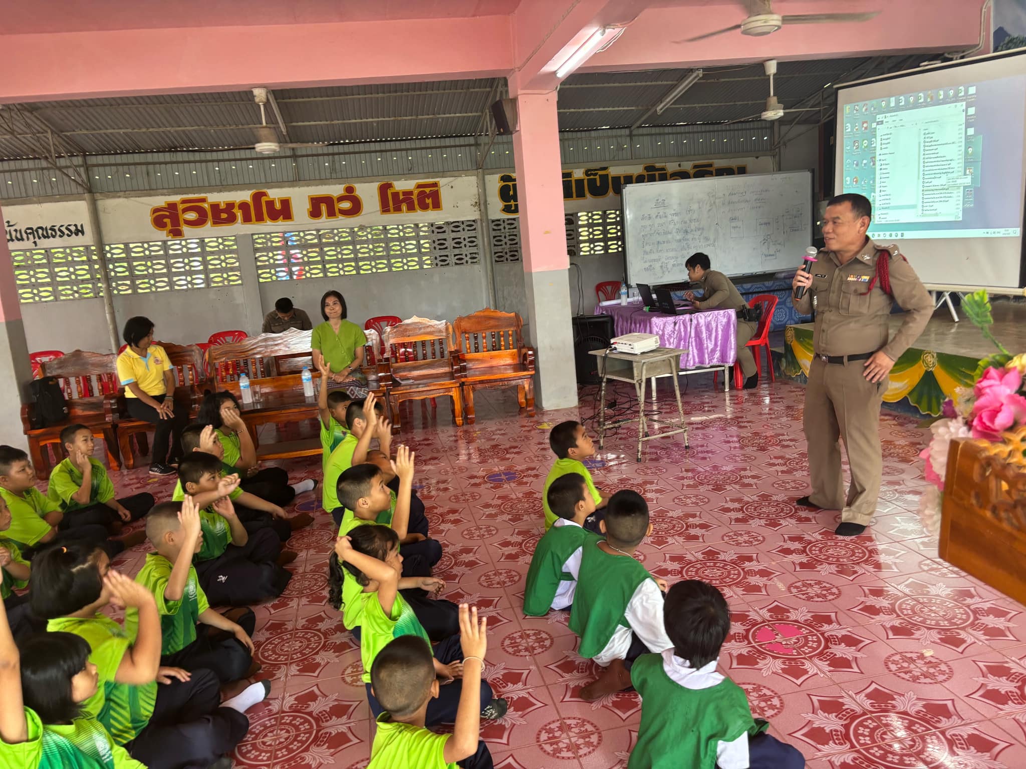 สภ.แม่จริม ภ.จว.น่าน วันนี้ ( 10 ต.ค.67 ) เวลา 09.00 น. โดยการอำนวยการของ พ.ต.อ.วสันติ์ หมั่นสลุง ผกก.สภ.แม่จริม, พ.ต.ท. วีฬเวชน์ ร้านชิตวงศ์ รองผกก.ป.สภ.แม่จริม, พ.ต.ท.มนตรี ขอดเตชะ สวป.สภ.แม่จริม มอบหมายให้ ร.ต.อ.พงศ์พันธุ์ มีสา รอง สวป.สภ.แม่จริม พร้อมด้วยตำรวจชุดชุมชนและมวลชนสัมพันธ์ สภ.แม่จริม ร่วมเป็นวิทยากรบรรยายให้ความรู้เรื่องยาเสพติดและภัยออนไลน์ ให้แก่เด็กนักเรียนโรงเรียนบ้านก้อ ณ หอประชุมโรงเรียนบ้านก้อ ม.2 ต.แม่จริม อ.แม่จริม จ.น่าน