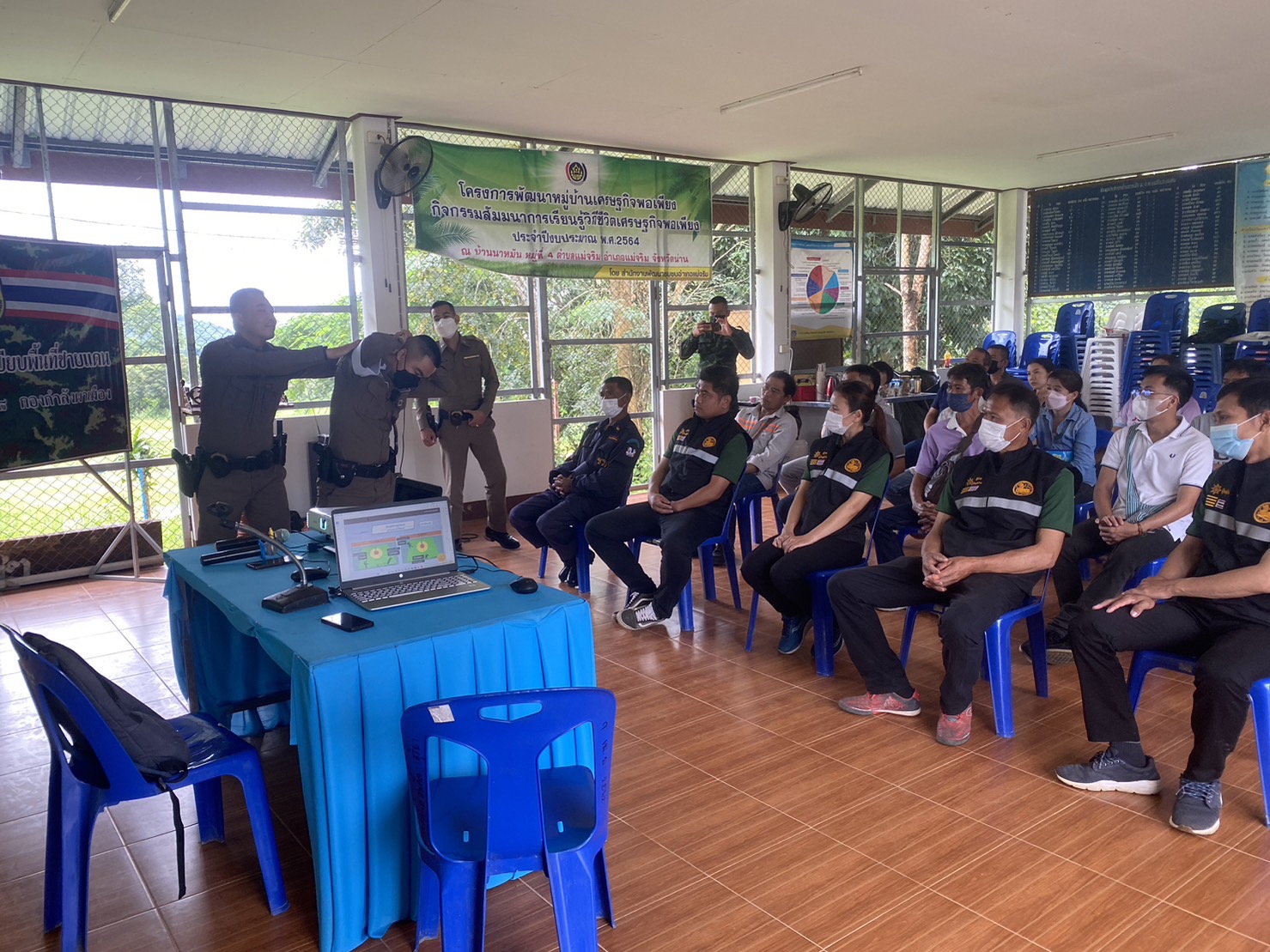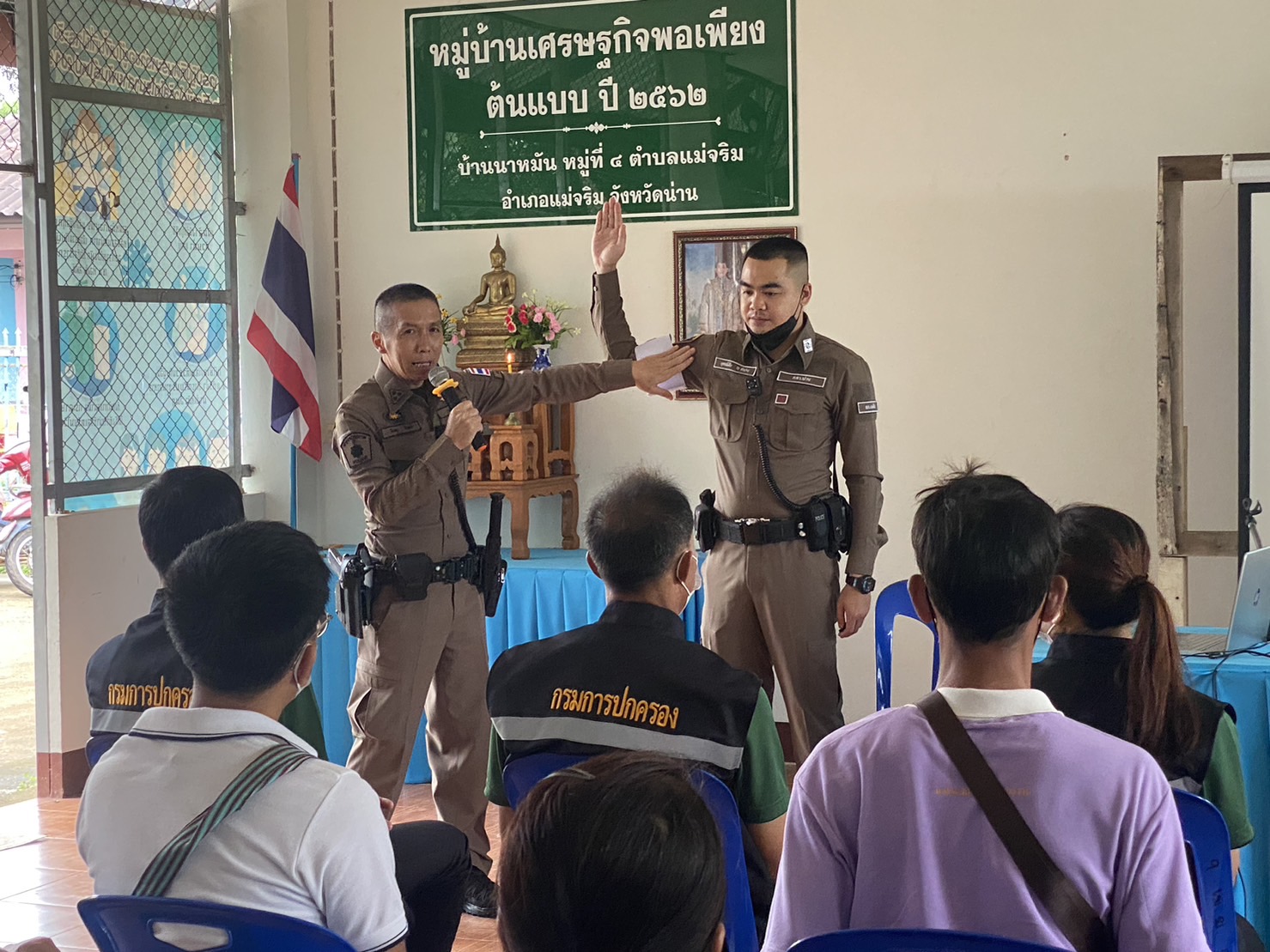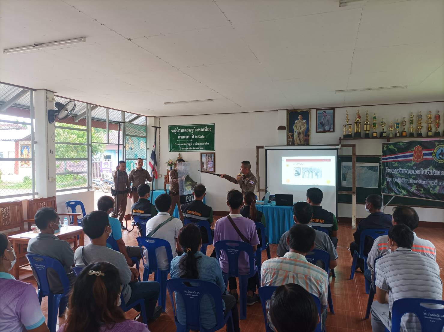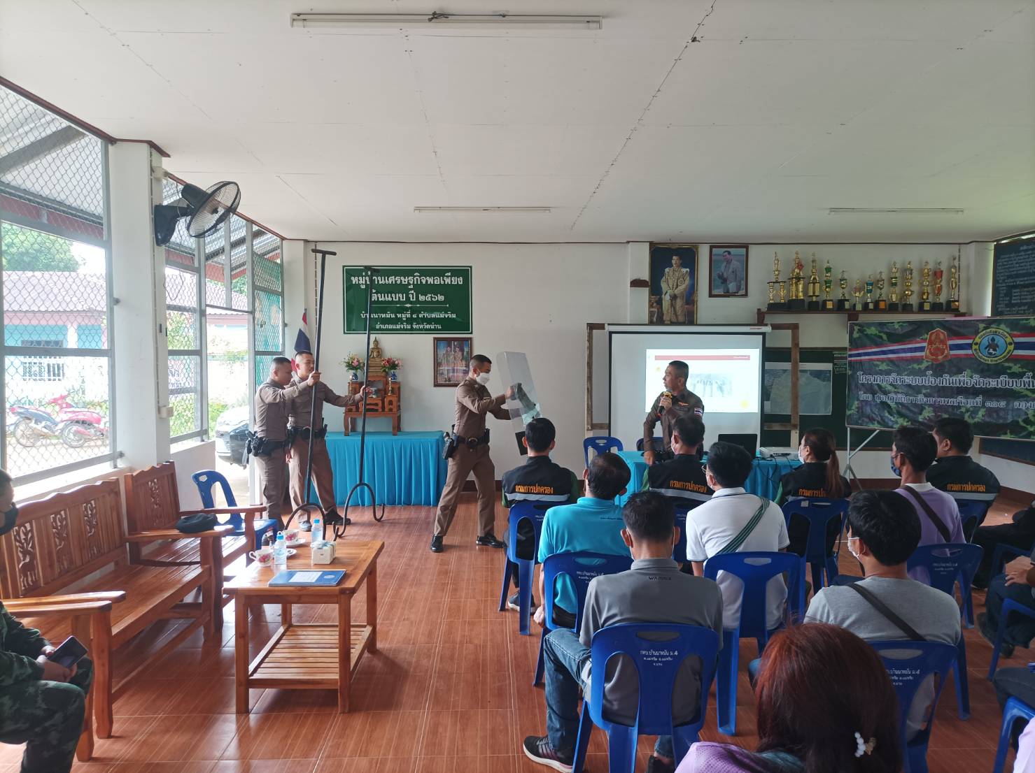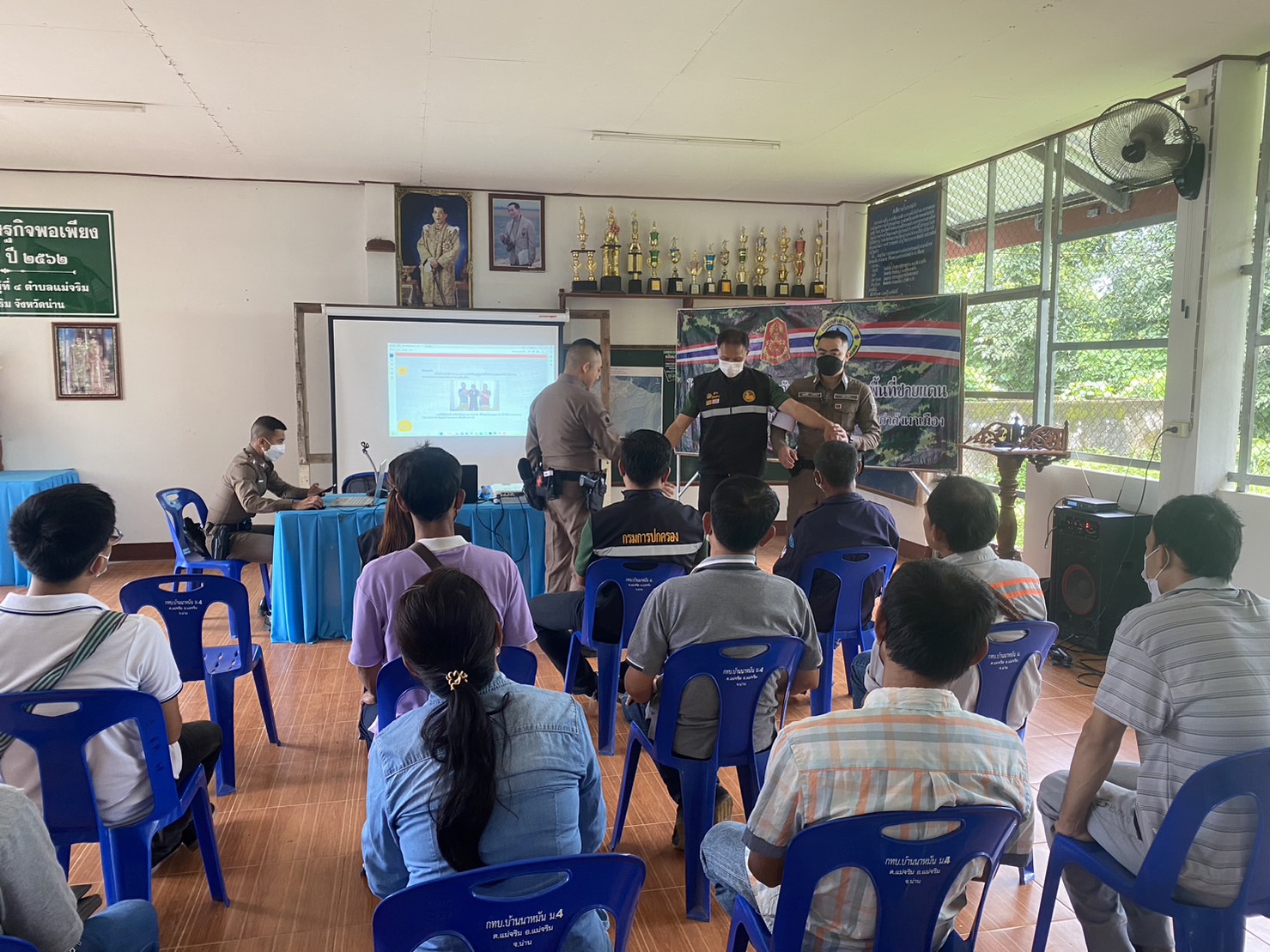 สภ.แม่จริม ภ.จว.น่าน วันนี้ (25 ส.ค.2566) เวลา 08.30 – 12.00 น. โดยการอำนวยการของ พ.ต.อ.ปรีชา เนตรประชา ผกก.สภ.แม่จริม มอบหมายให้ พ.ต.ท.บุญมาก กันบุญ สวป.สภ.แม่จริม พร้อมด้วย ร.ต.อ.วิชาญ ชินายศ รอง สวป.สภ.แม่จริม และเจ้าหน้าที่ตำรวจชุดปฏิบัติการชุมชนและมวลชนสัมพันธ์ เป็นวิทยากรให้ความรู้ในเรื่องบทบาทหน้าที่ของผู้ช่วยเจ้าพนักงาน ทัศนะสัญญาณจราจร เพื่อใช้ในการตั้งจุดตรวจ/จุดสกัด เทคนิคการตรวจค้น และการสาธิตเข้าระงับเหตุผู้ป่วยจิตเวชคลุ้มคลั่งให้กับ กลุ่มผู้นำชุมชน หมู่บ้าน และชุดรักษาความปลอดภัยของหมู่บ้าน ในการฝึกอบรมการดำรงสภาพกำลังประชาชนพิทักษ์ชายแดน และการจัดตั้งเครือข่ายภาคประชาชน ตามโครงการจัดระบบป้องกันเพื่อจัดระเบียบพื้นที่ชายแดน ในเขตพื้นที่รับผิดชอบอำเภอแม่จริม ณ หอประชุมประจำหมู่บ้าน บ้านนาหมัน ม.4 ต.แม่จริม อ.แม่จริม จ.น่าน