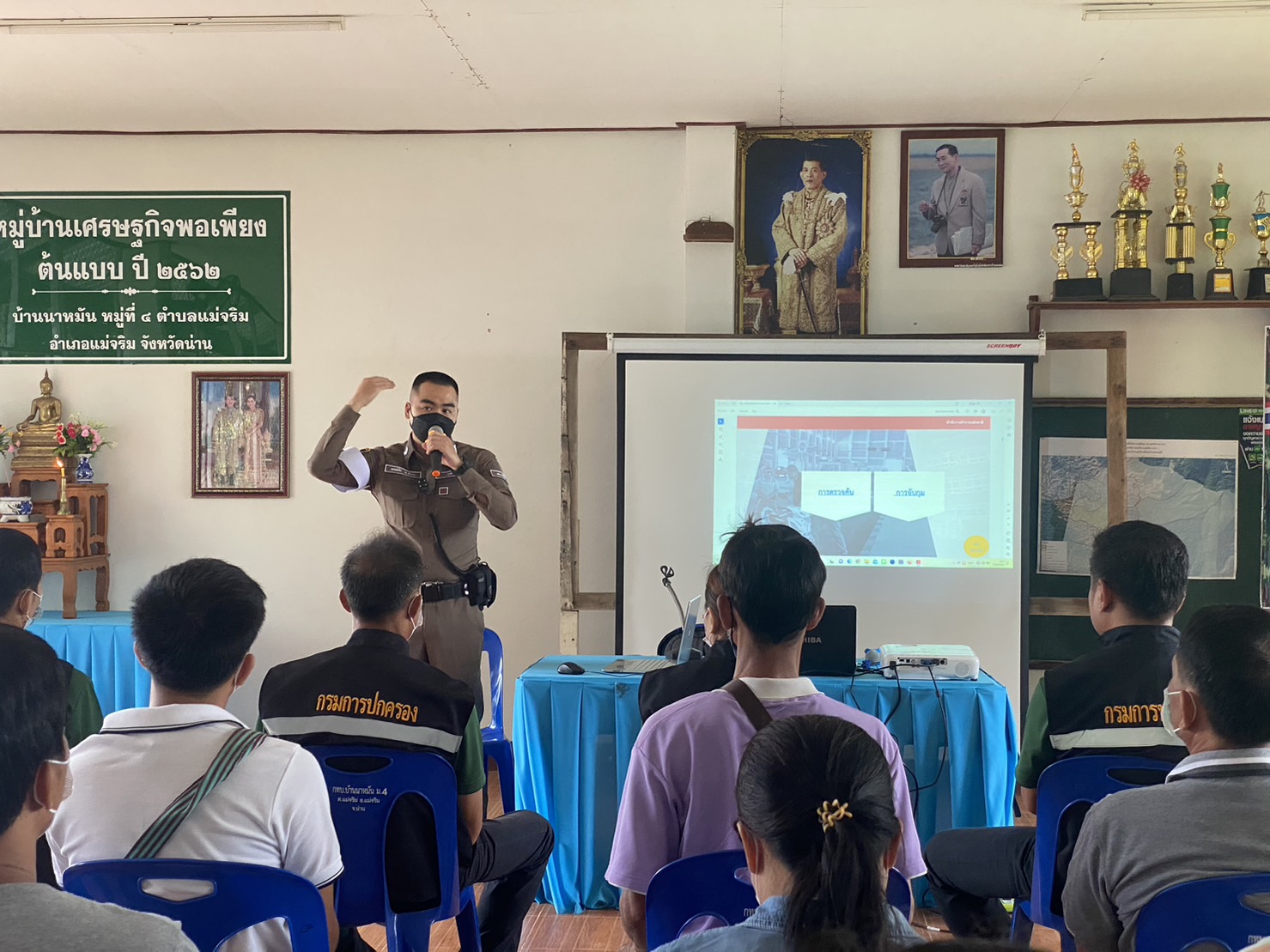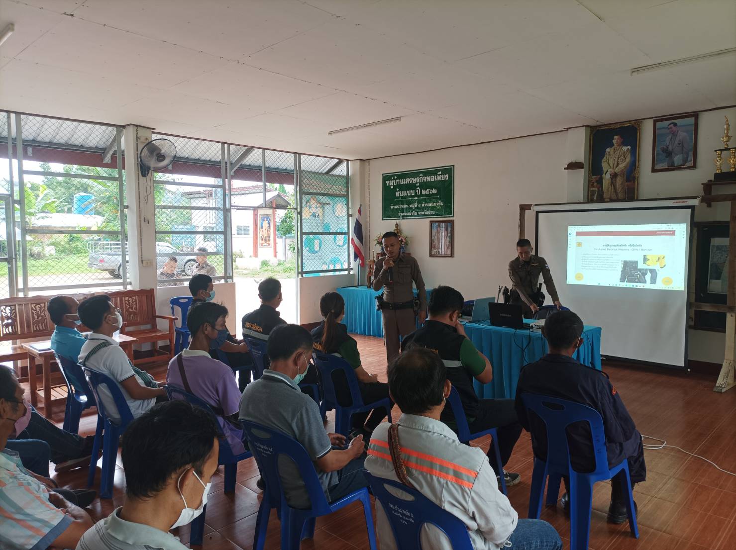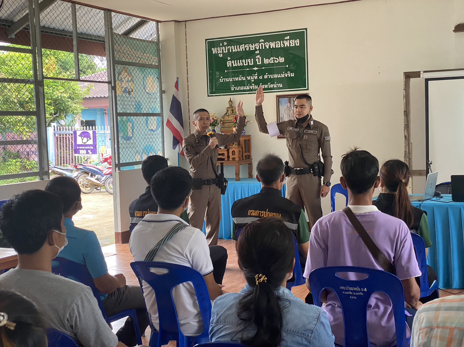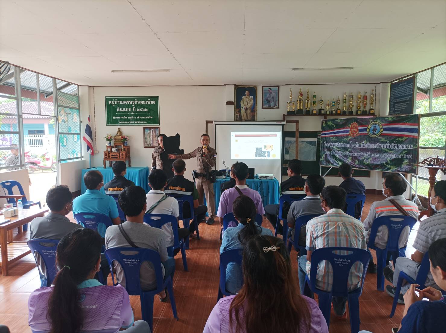 สภ.แม่จริม ภ.จว.น่าน วันนี้ (25 ส.ค.2566) เวลา 08.30 – 12.00 น. โดยการอำนวยการของ พ.ต.อ.ปรีชา เนตรประชา ผกก.สภ.แม่จริม มอบหมายให้ พ.ต.ท.บุญมาก กันบุญ สวป.สภ.แม่จริม พร้อมด้วย ร.ต.อ.วิชาญ ชินายศ รอง สวป.สภ.แม่จริม และเจ้าหน้าที่ตำรวจชุดปฏิบัติการชุมชนและมวลชนสัมพันธ์ เป็นวิทยากรให้ความรู้ในเรื่องบทบาทหน้าที่ของผู้ช่วยเจ้าพนักงาน ทัศนะสัญญาณจราจร เพื่อใช้ในการตั้งจุดตรวจ/จุดสกัด เทคนิคการตรวจค้น และการสาธิตเข้าระงับเหตุผู้ป่วยจิตเวชคลุ้มคลั่งให้กับ กลุ่มผู้นำชุมชน หมู่บ้าน และชุดรักษาความปลอดภัยของหมู่บ้าน ในการฝึกอบรมการดำรงสภาพกำลังประชาชนพิทักษ์ชายแดน และการจัดตั้งเครือข่ายภาคประชาชน ตามโครงการจัดระบบป้องกันเพื่อจัดระเบียบพื้นที่ชายแดน ในเขตพื้นที่รับผิดชอบอำเภอแม่จริม ณ หอประชุมประจำหมู่บ้าน บ้านนาหมัน ม.4 ต.แม่จริม อ.แม่จริม จ.น่าน