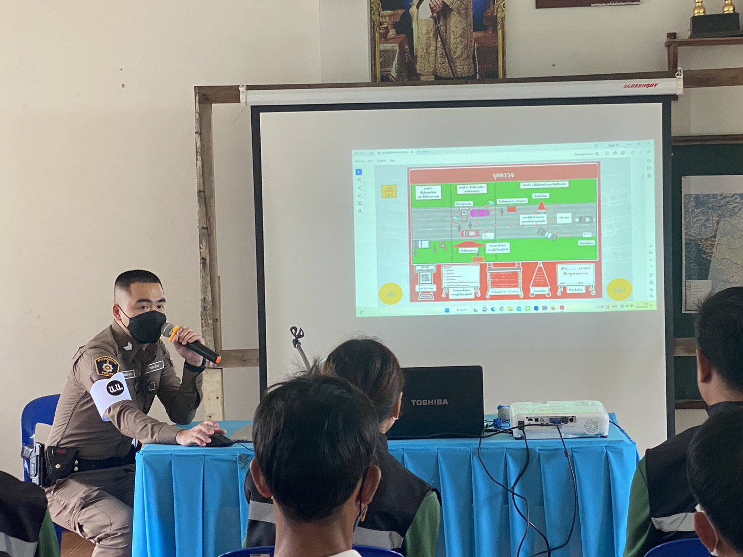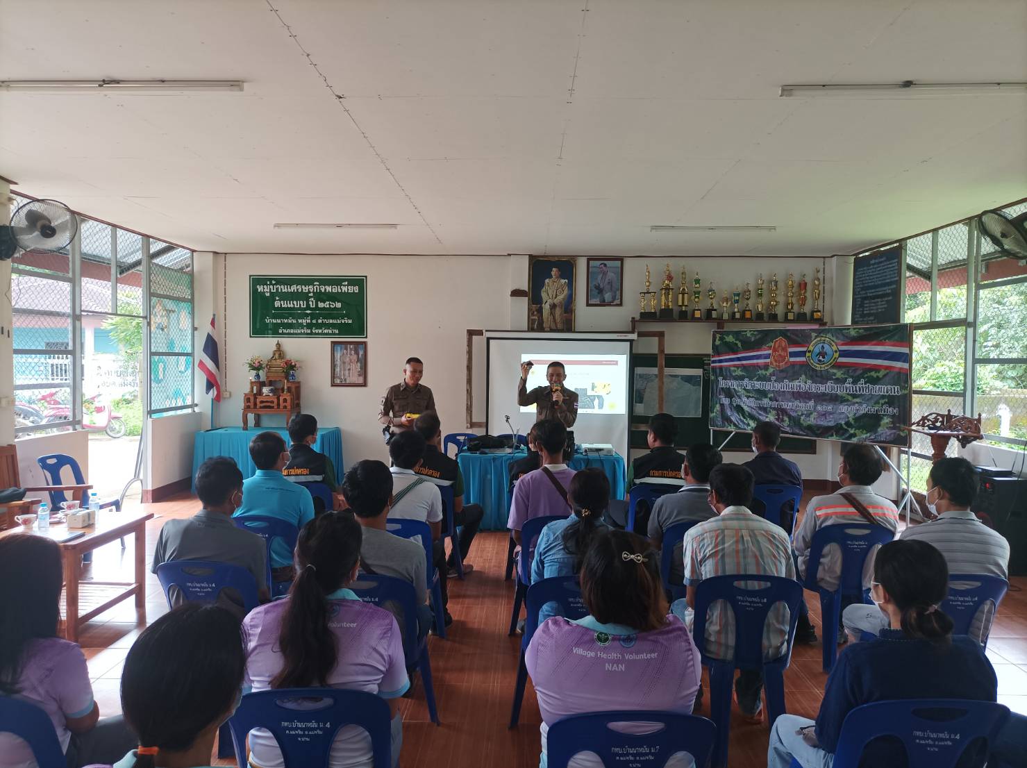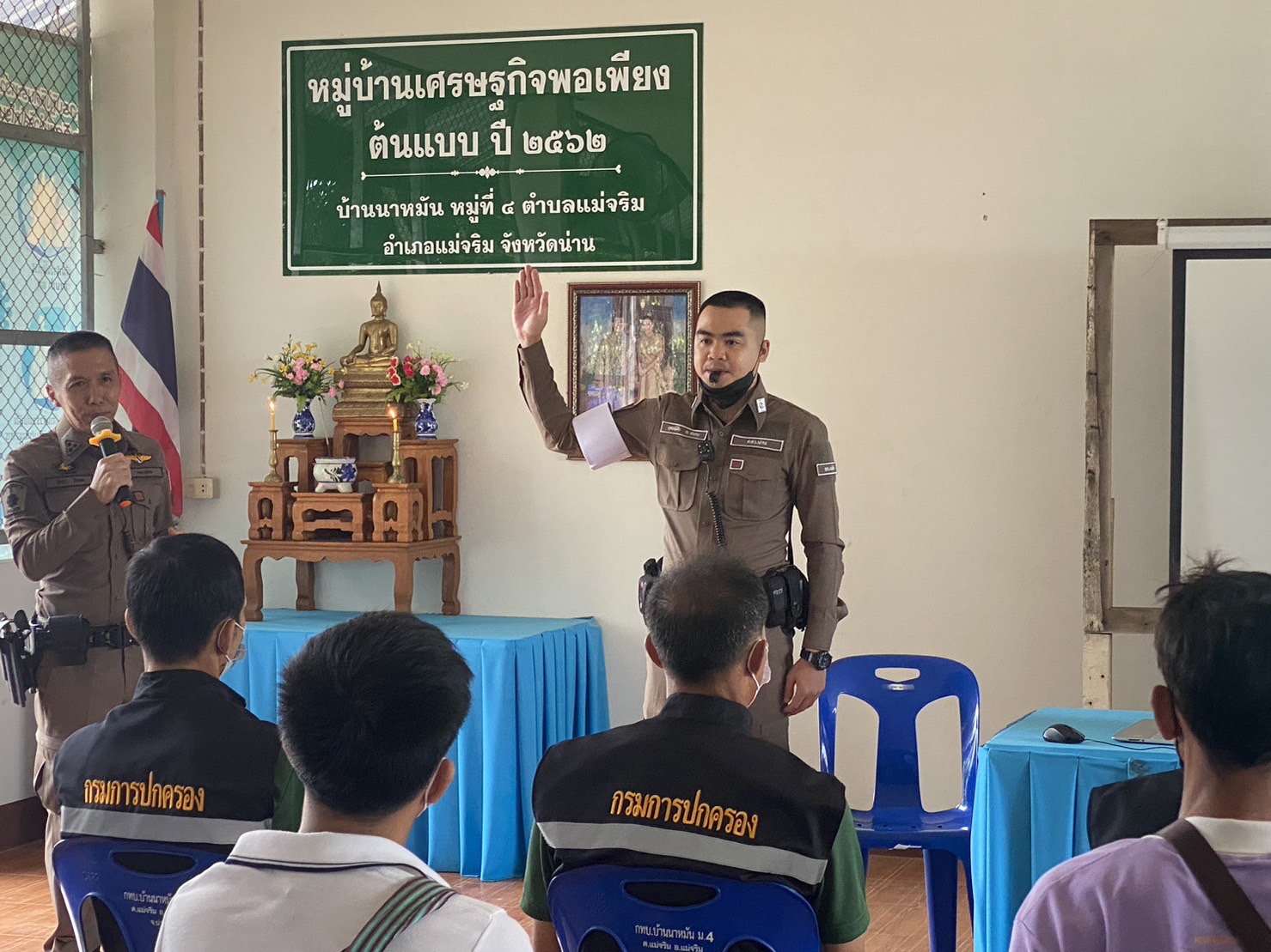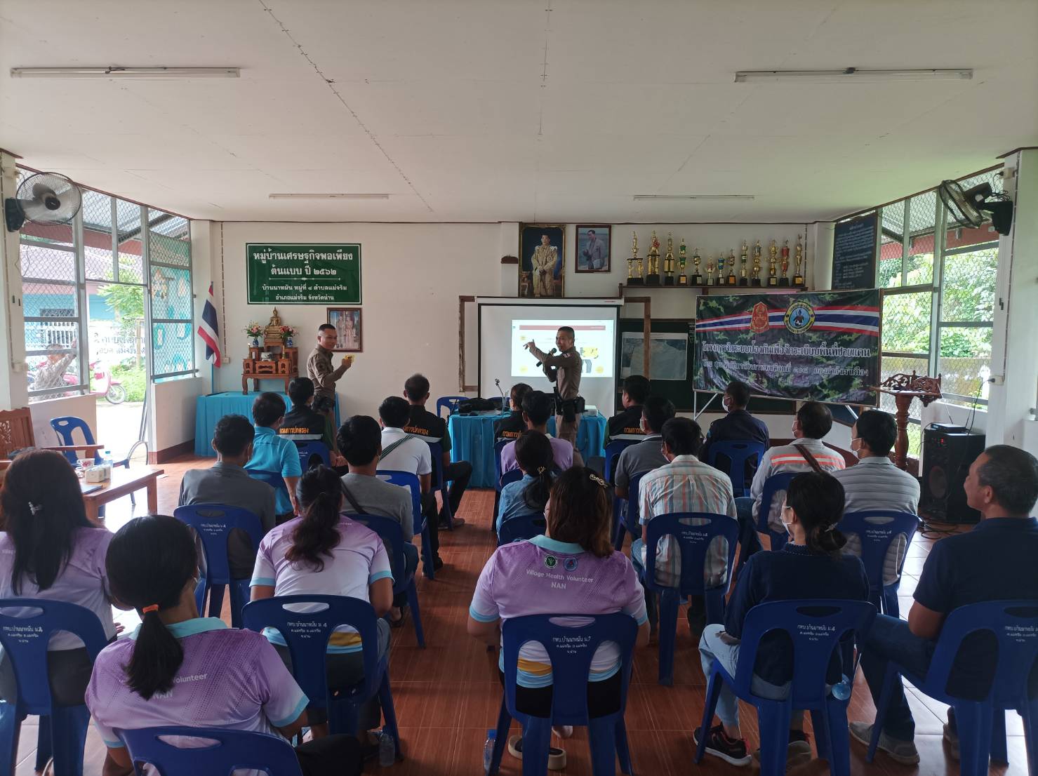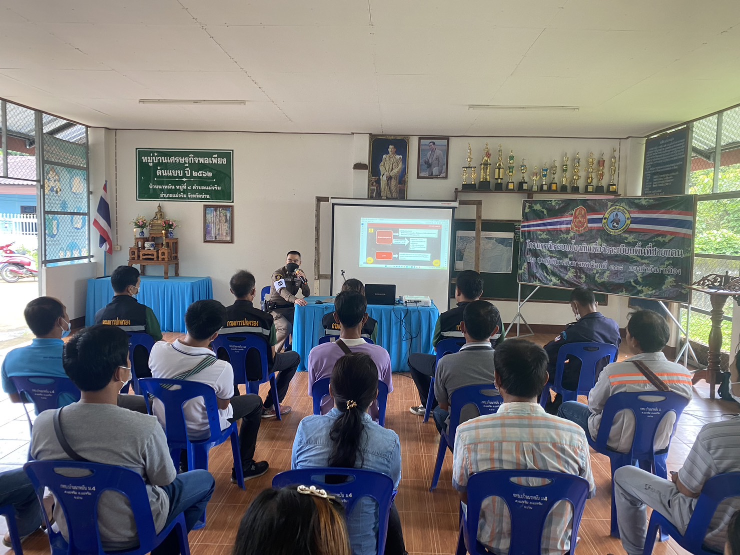 สภ.แม่จริม ภ.จว.น่าน วันนี้ (25 ส.ค.2566) เวลา 08.30 – 12.00 น. โดยการอำนวยการของ พ.ต.อ.ปรีชา เนตรประชา ผกก.สภ.แม่จริม มอบหมายให้ พ.ต.ท.บุญมาก กันบุญ สวป.สภ.แม่จริม พร้อมด้วย ร.ต.อ.วิชาญ ชินายศ รอง สวป.สภ.แม่จริม และเจ้าหน้าที่ตำรวจชุดปฏิบัติการชุมชนและมวลชนสัมพันธ์ เป็นวิทยากรให้ความรู้ในเรื่องบทบาทหน้าที่ของผู้ช่วยเจ้าพนักงาน ทัศนะสัญญาณจราจร เพื่อใช้ในการตั้งจุดตรวจ/จุดสกัด เทคนิคการตรวจค้น และการสาธิตเข้าระงับเหตุผู้ป่วยจิตเวชคลุ้มคลั่งให้กับ กลุ่มผู้นำชุมชน หมู่บ้าน และชุดรักษาความปลอดภัยของหมู่บ้าน ในการฝึกอบรมการดำรงสภาพกำลังประชาชนพิทักษ์ชายแดน และการจัดตั้งเครือข่ายภาคประชาชน ตามโครงการจัดระบบป้องกันเพื่อจัดระเบียบพื้นที่ชายแดน ในเขตพื้นที่รับผิดชอบอำเภอแม่จริม ณ หอประชุมประจำหมู่บ้าน บ้านนาหมัน ม.4 ต.แม่จริม อ.แม่จริม จ.น่าน