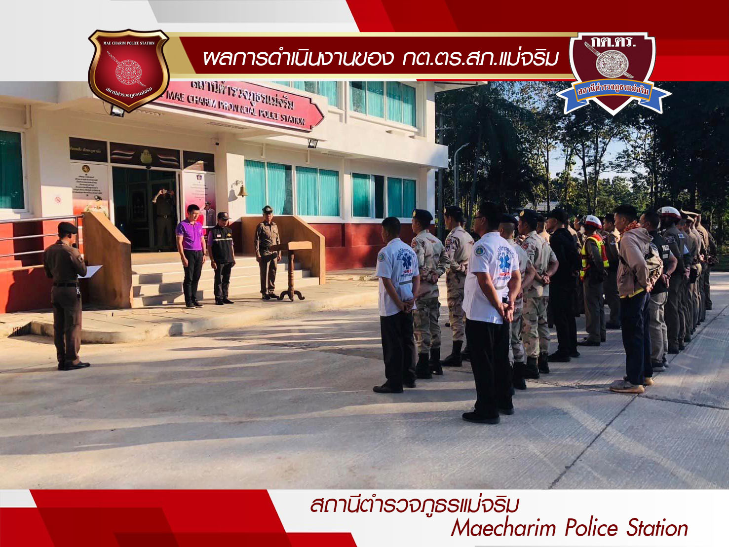 การปฏิบัติด้านการป้องกันปราบปรามอาชญากรรม ในการมีส่วนร่วมของ กต.ตร.สภ.แม่จริม สภ.แม่จริม ภ.จว.น่าน วันที่ (27 ธ.ค.2566) เวลา 17.00 น. โดยการอำนวยการของ พ.ต.อ.วสันติ์ หมั่นสลุง ผกก.สภ.แม่จริม, นายสามารถ วงค์เลียบ นายกเทศมนตรีตำบลหนองแดง ประธาน กต.ตร.สภ.แม่จริม มอบหมายให้ พ.ต.ท.วีฬเวชน์ ร้านชิตวงศ์ รอง ผกก.ป.ฯ รรท.ผกก.สภ.แม่จริม , พ.ต.ท.มนตรี ขอดเตชะ สวป.สภ.แม่จริม , ร.ต.อ.ภูริภัทร อินต๊ะสิน รอง สวป.สภ.แม่จริม , ร.ต.ต.ภูมิวิกรณ์ สอนนนท์ฐีกูล รอง สว.(ป.) สภ.แม่จริม , ร.ต.ต.กิติพิชญ์ ระจัน รอง สว.(ป.) สภ.แม่จริม พร้อมด้วยคณะกรรมการ กต.ตร.สภ.แม่จริม และข้าราชการตำรวจในสังกัด บูรณาการร่วมกับเจ้าหน้าที่ฝ่ายปกครอง , เจ้าหน้าที่ อส.อำเภอแม่จริม , เจ้าหน้าที่กู้ชีพ กู้ภัย เทศบาลตำบลหนองแดง ร่วมพิธีปล่อยแถวระดมกวาดล้างอาชญากรรม ในช่วงเทศกาลปีใหม่ ประจำปี พ.ศ. 2567 ณ ลานหน้าอาคารที่ทำการสถานีตำรวจภูธรแม่จริม