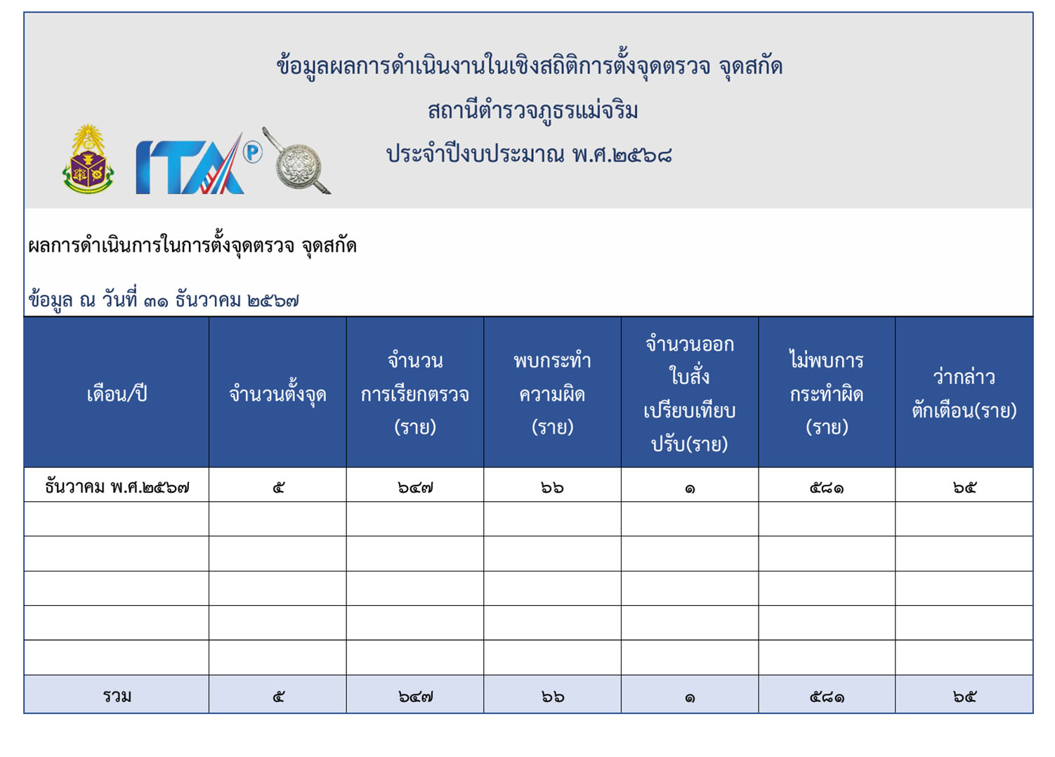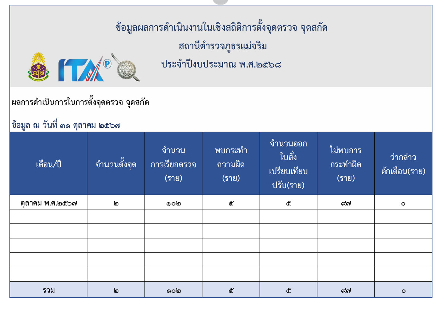 🔰 ข้อมูลผลการดำเนินงานในเชิงสถิติการตั้งจุดตรวจ จุดสกัด