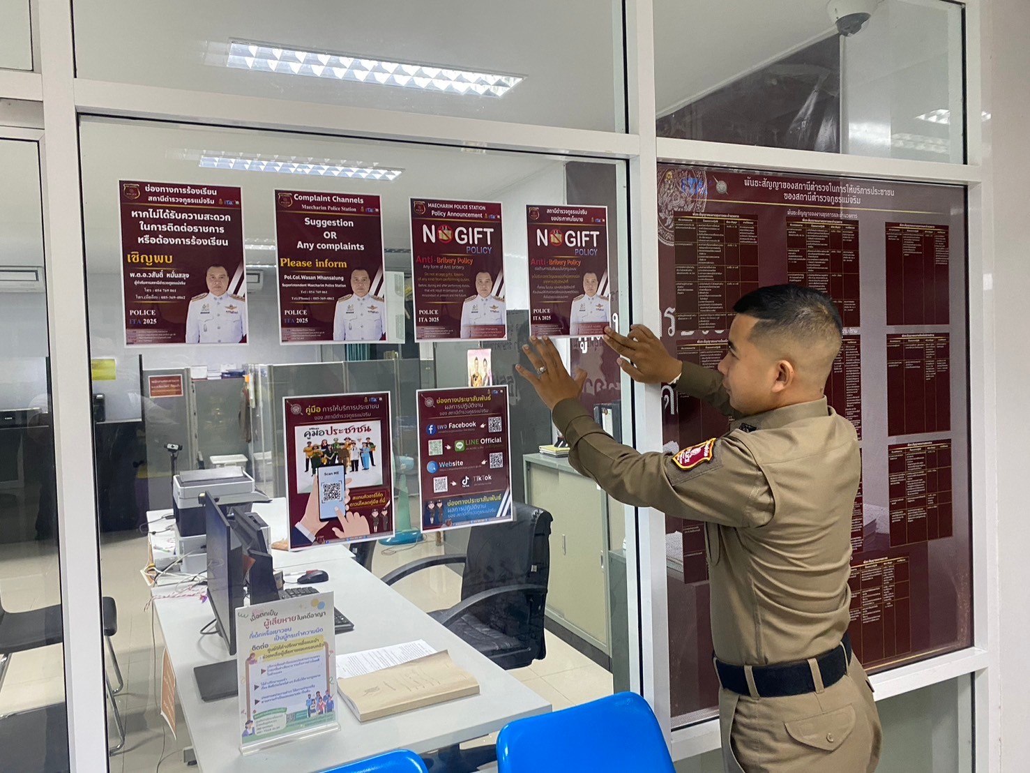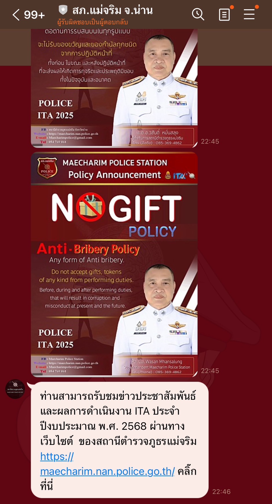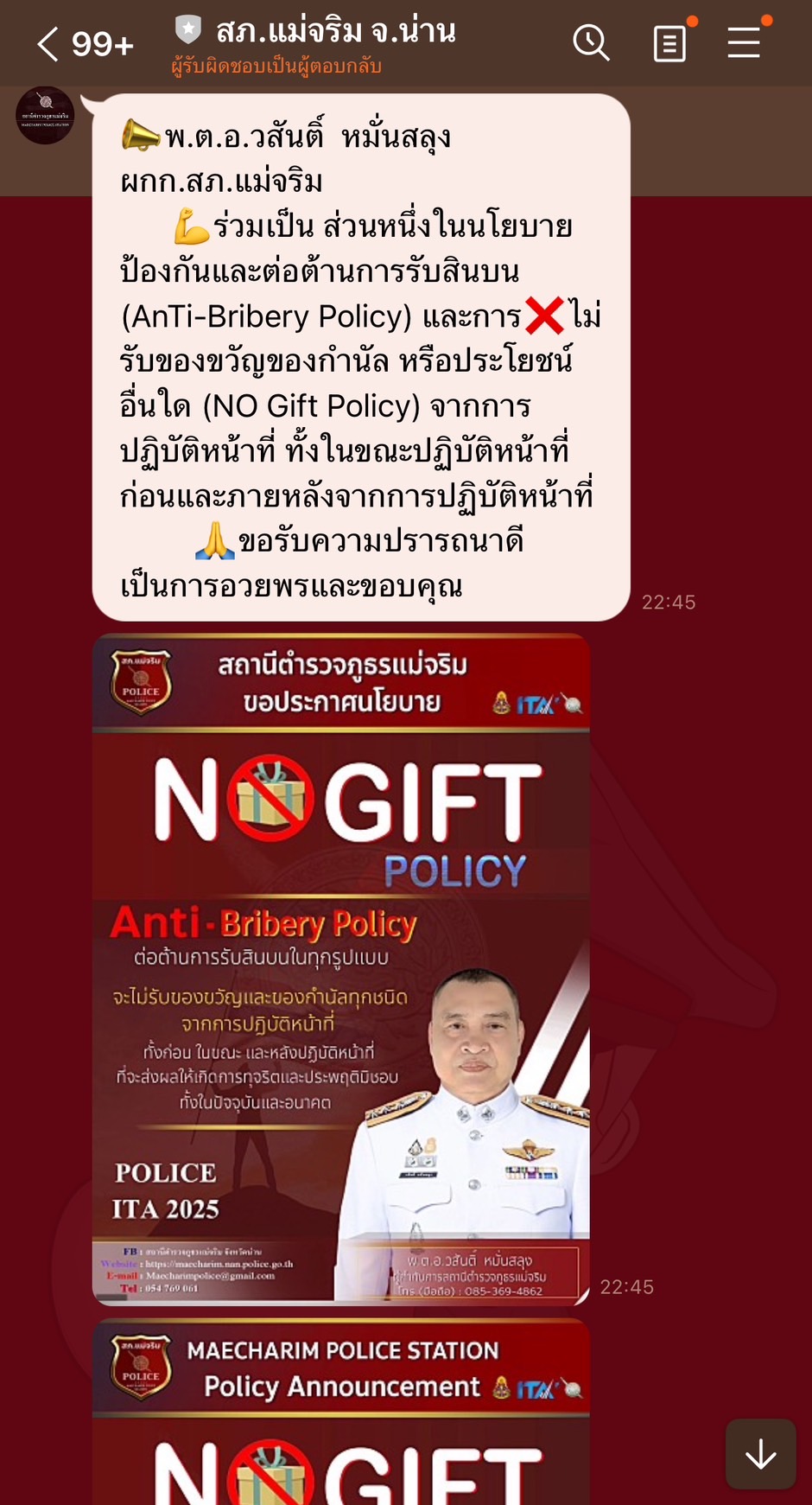 พ.ต.อ.วสันติ์ หมั่นสลุง ผกก.สภ.แม่จริม ประชุมข้าราชการตำรวจในสังกัด กำหนดมาตรการ แนวทาง และกลไกในการป้องกันการให้/รับสินบน ให้ข้าราชการตำรวจร่วมเป็นส่วนหนึ่งในนโยบายป้องกันและต่อต้านการรับสินบน (AnTi-Bribery Policy) และการไม่รับของขวัญของกำนัลหรือประโยชน์อื่นใด จากการปฏิบัติหน้าที่ (NO Gift Policy)
