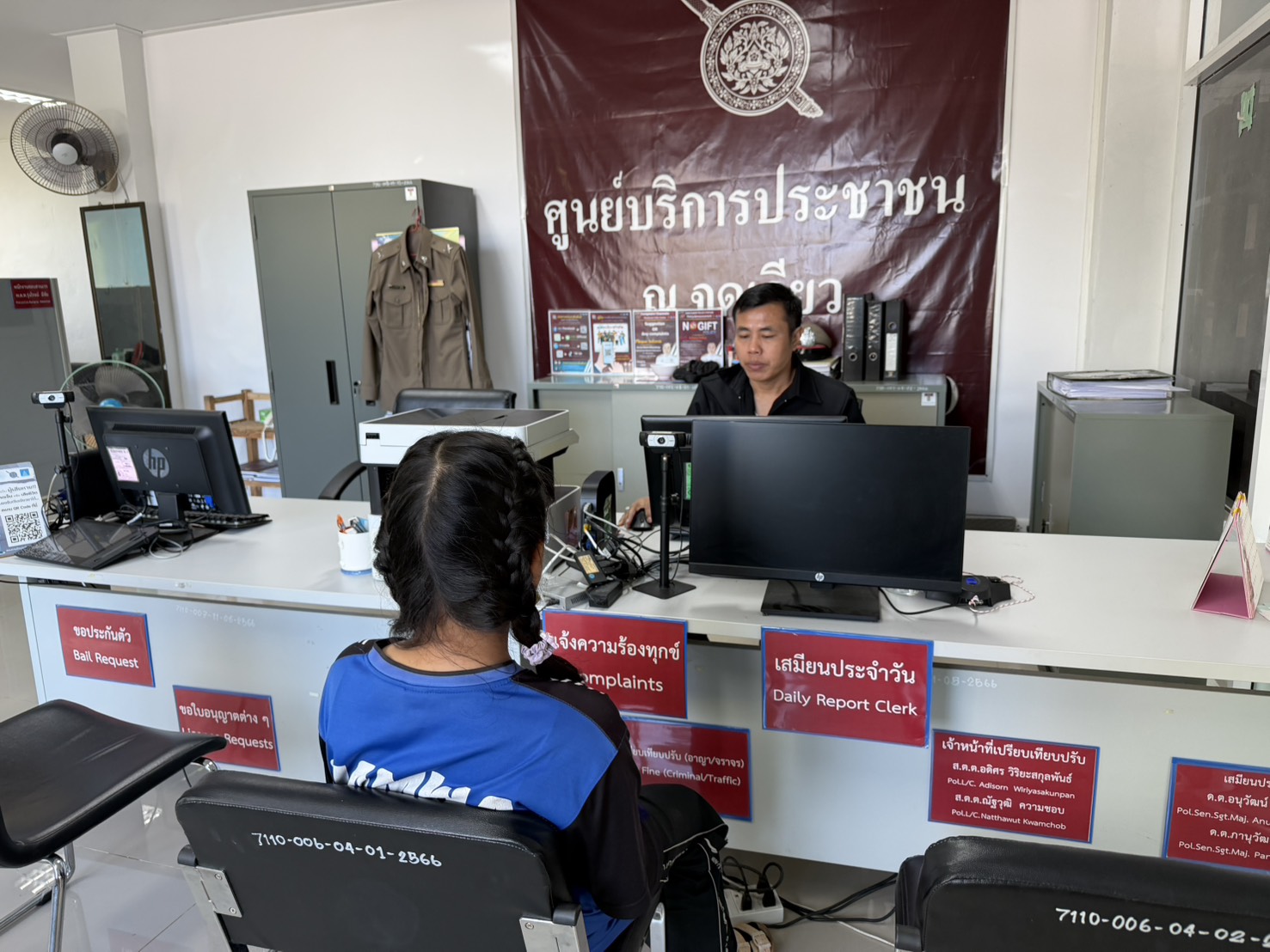 ด.ต.ภานุวัฒน์ มูลฐี ผบ.หมู่ (ป.) สภ.แม่จริม ให้บริการประชาชนมาแจ้งความดำเนินคดี ที่สถานีตำรวจ